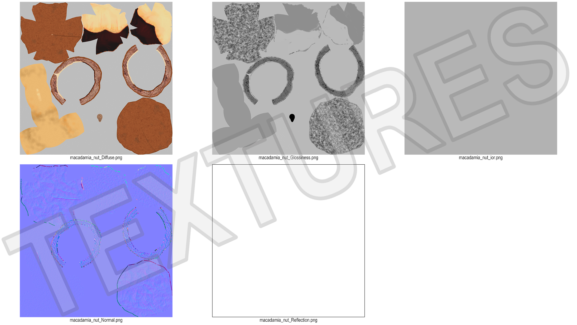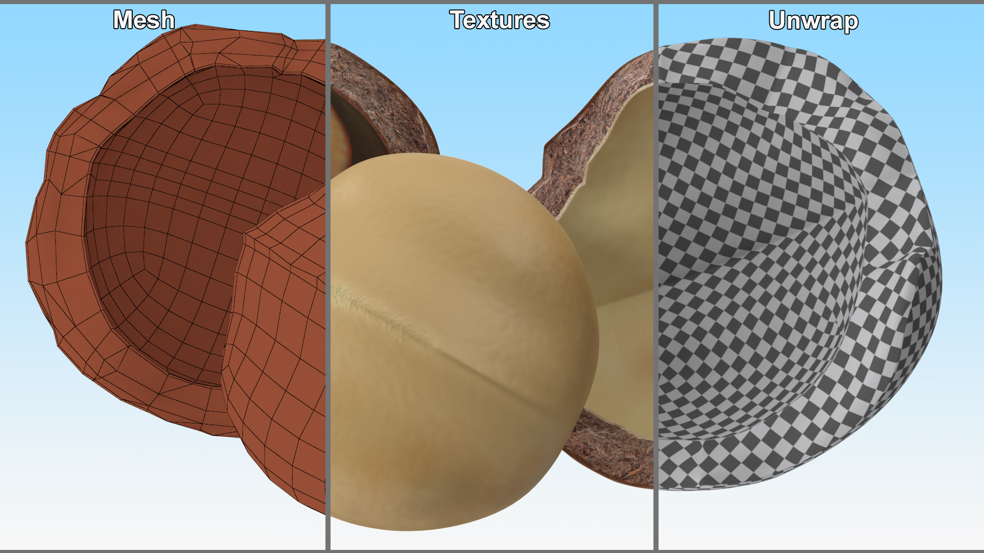 Split Macadamia Nut is a three-dimensional model of split nut type fruit of Macadamia tree (Queensland nut, Hawaii nut, bush nut, maroochi nut, and bauple nut), which is a genus of four species of trees in the flowering plant family Proteaceae, and which is indigenous to Australia.