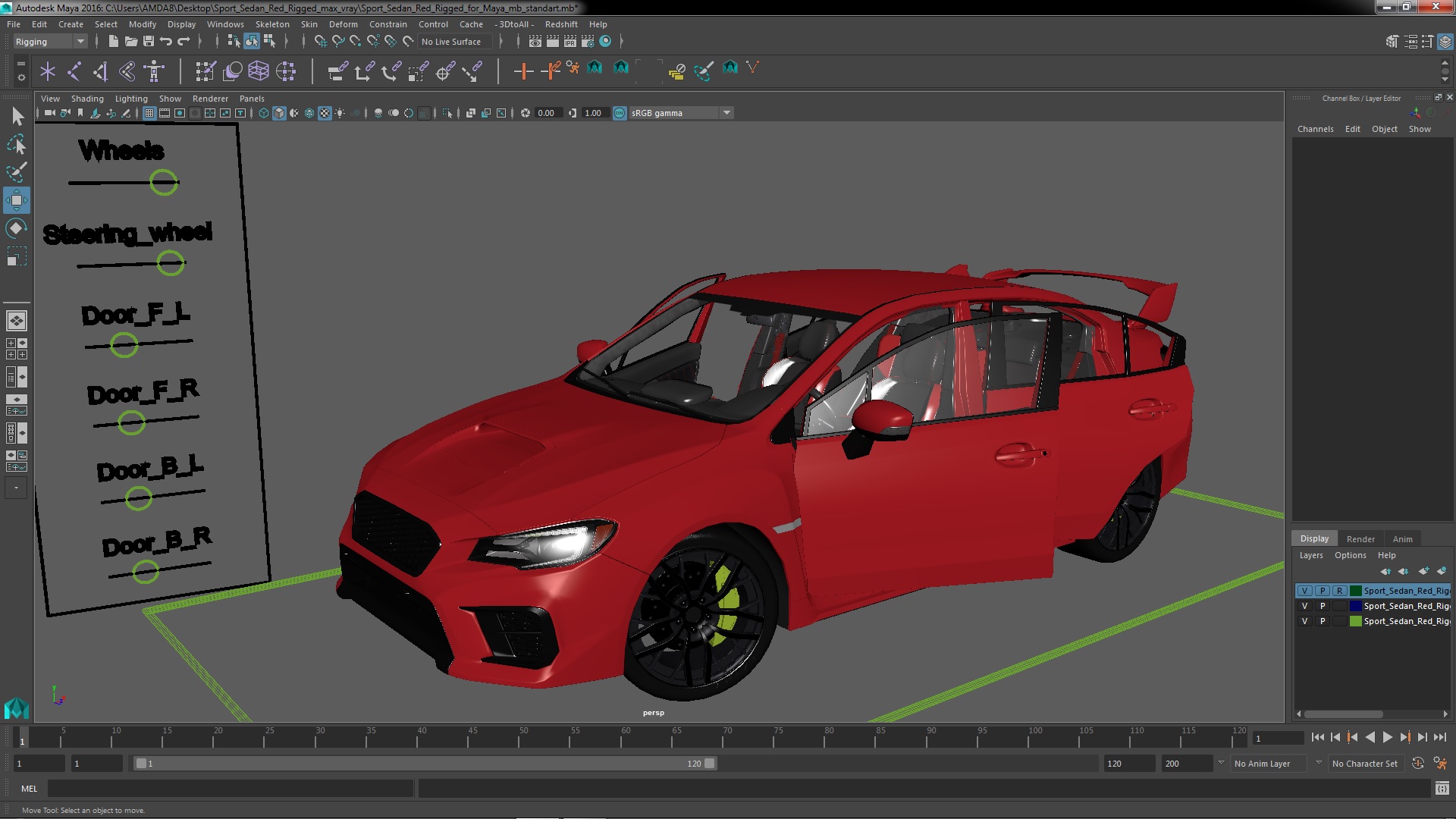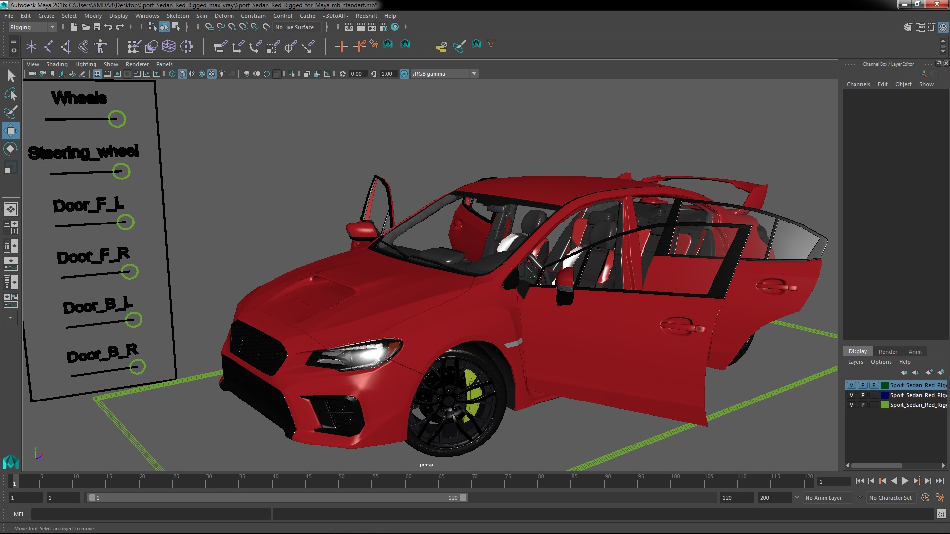 Sport Sedan Red Rigged for Maya is fully rigged and is ready to be animated in Maya. You can easily position it the way you need or animate it the way your project requires. See the screenshots to get an idea of how rigging works. The pose of the model on the render images is an example and can be recreated using rig, it is not initially included into the product.