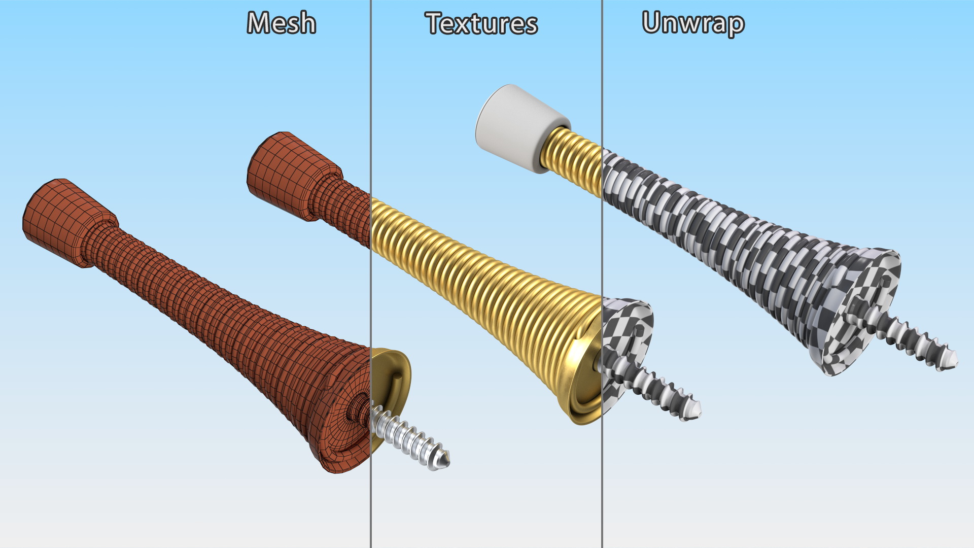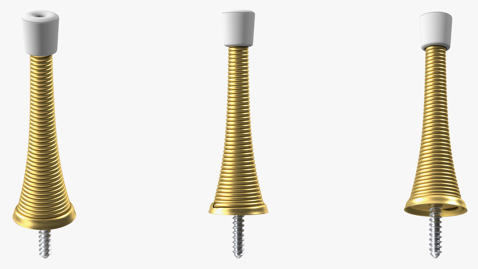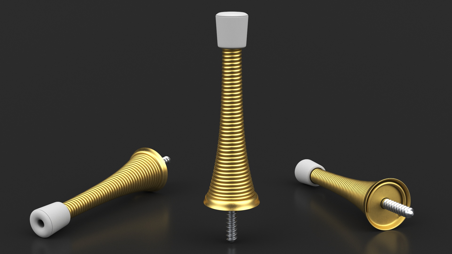 Spring Door Stopper Gold is a three-dimensional model of spring-loaded door stopper with a floor screw which is a small device used to prevent doors from swinging open too widely and damaging walls or furniture. It consists of a spring mechanism housed on a metal rod, attached to a sturdy base with a screw that anchors it to the floor. When the door is pushed open, the spring compresses, absorbing the force and gently stopping the door's movement. This prevents the door from slamming shut and offers protection to both the door and the surrounding area.