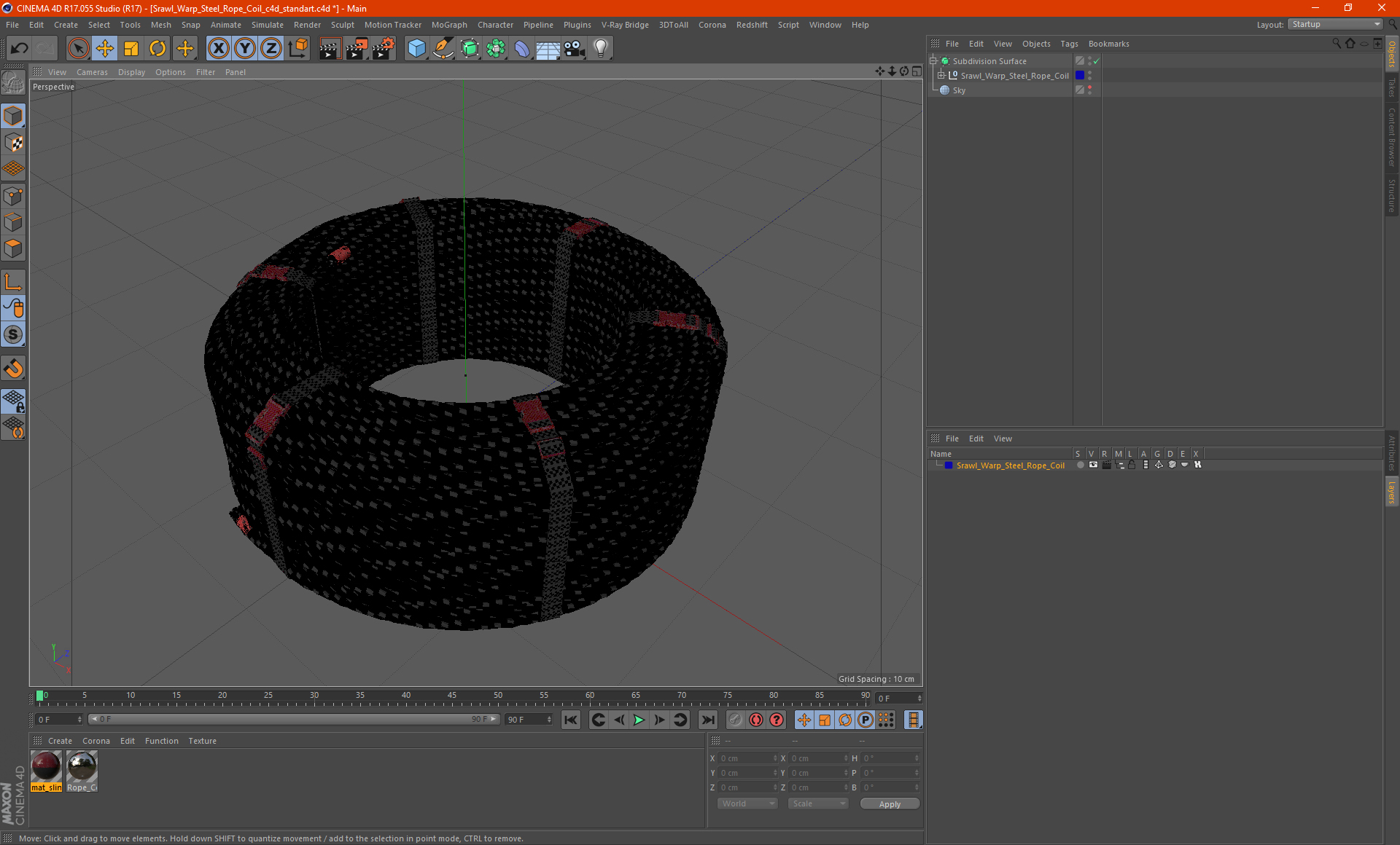 Srawl Warp Steel Rope Coil is a high quality, photo real 3d model that will enhance detail and realism to any of your rendering projects. The model has a fully textured, detailed design that allows for close-up renders, and was originally modeled in 3ds Max 2020 and rendered with V-Ray. Renders have no postprocessing!