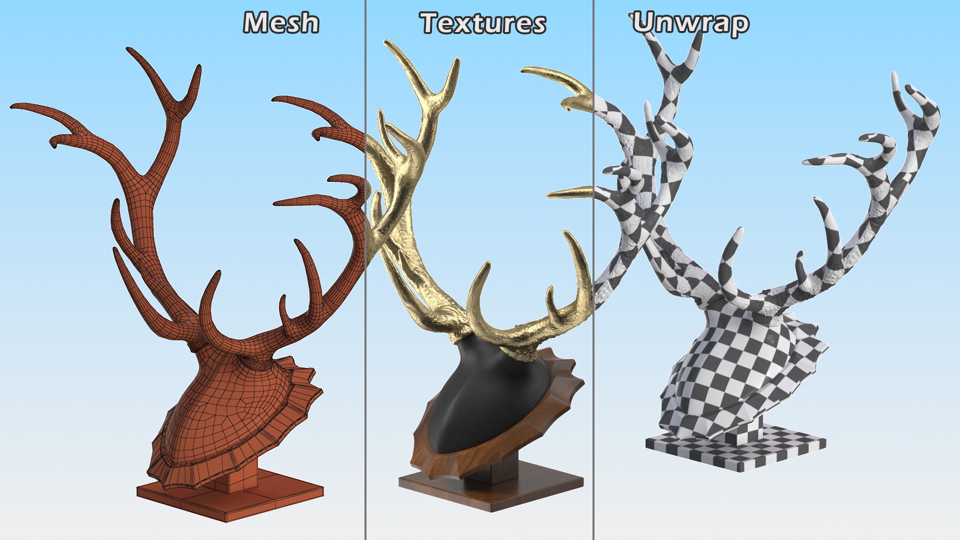 Stag Antlers on a Pedestal Gold Plated is a high quality, photo real 3d model that will enhance detail and realism to any of your rendering projects. The model has a fully textured, detailed design that allows for close-up renders, and was originally modeled in 3ds Max 2020 and rendered with V-Ray. Renders have no postprocessing!