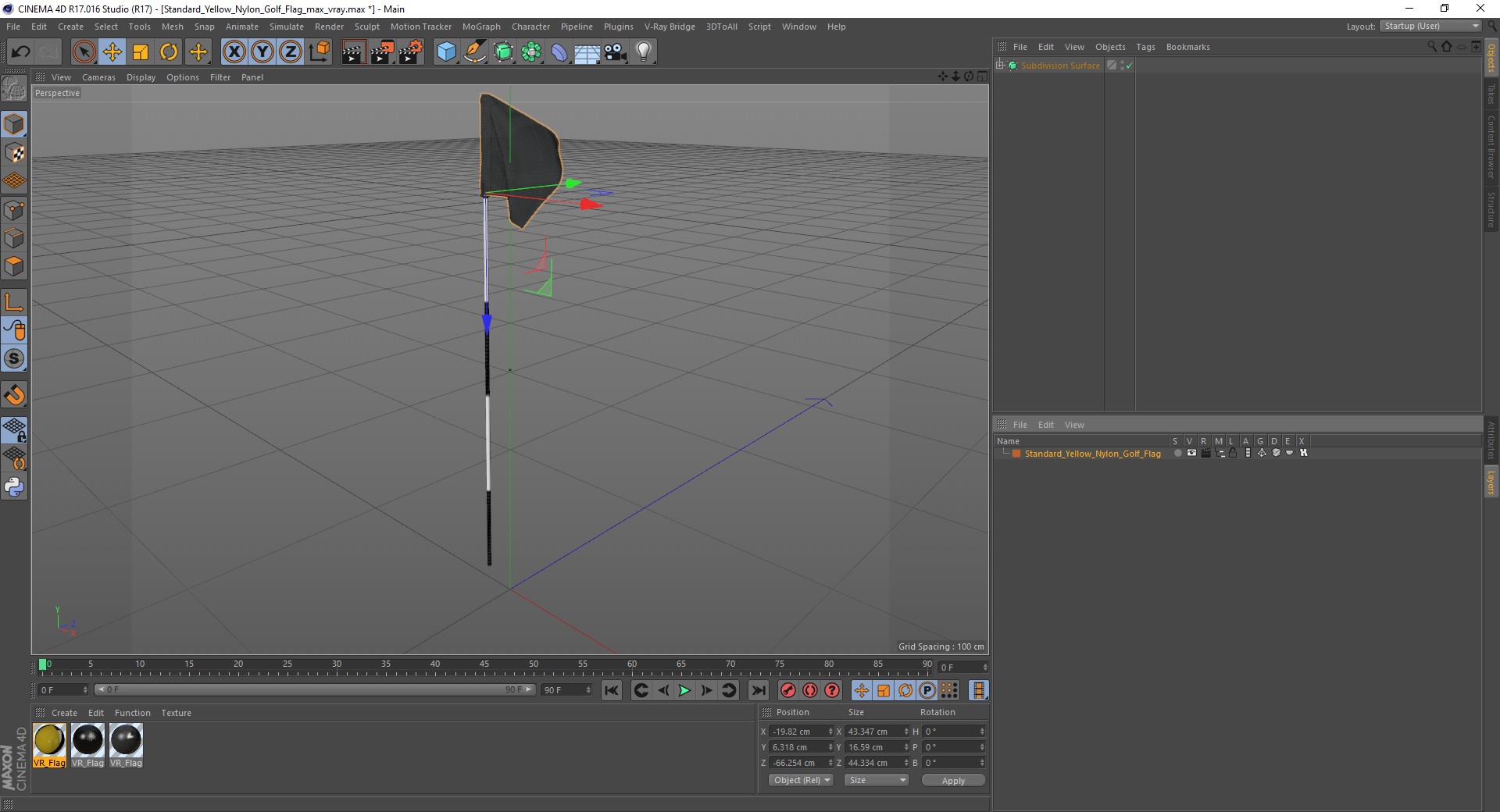 Standard Yellow Nylon Golf Flag is a high quality, photo real 3d model that will enhance detail and realism to any of your rendering projects. The model has a fully textured, detailed design that allows for close-up renders, and was originally modeled in 3ds Max 2020 and rendered with V-Ray. Renders have no postprocessing!