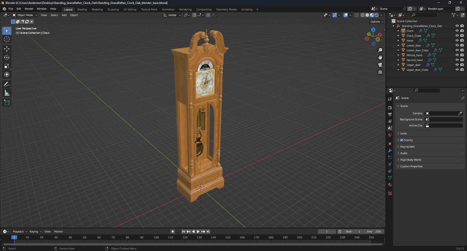 Standing Grandfather Clock Oak is a three-dimensional model of grandfather's clock (longcase clock, tall-case clock, hall clock or floor clock) that is a tall, freestanding, weight-driven pendulum clock.