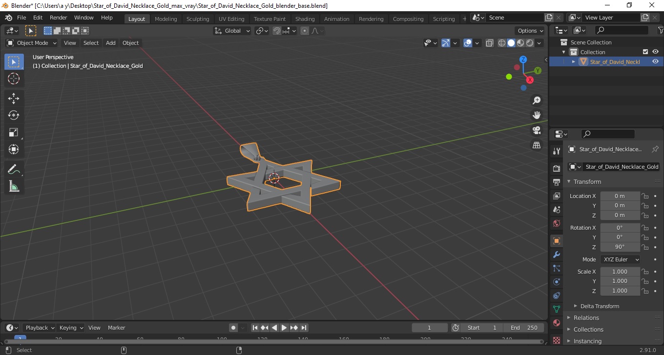 Star of David Necklace Gold is a high quality, photo real 3d model that will enhance detail and realism to any of your rendering projects. The model has a fully textured, detailed design that allows for close-up renders, and was originally modeled in 3ds Max 2020 and rendered with V-Ray. Renders have no postprocessing!