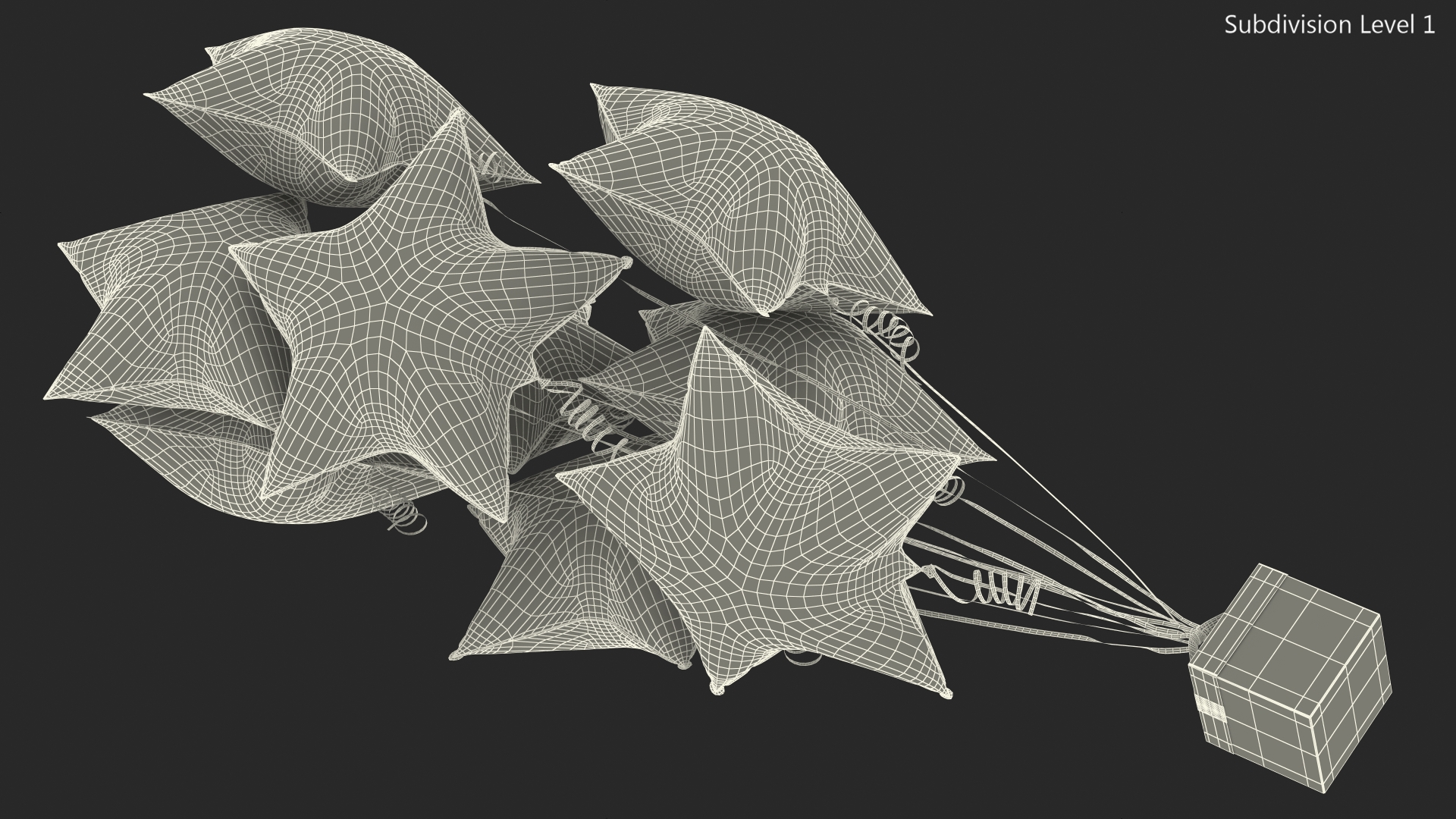 Star Shaped Gold Balloons Tied to Gift Box is a three-dimensional model of a bunch of flying star-shaped balloons which are tied to a special square carton gift package.