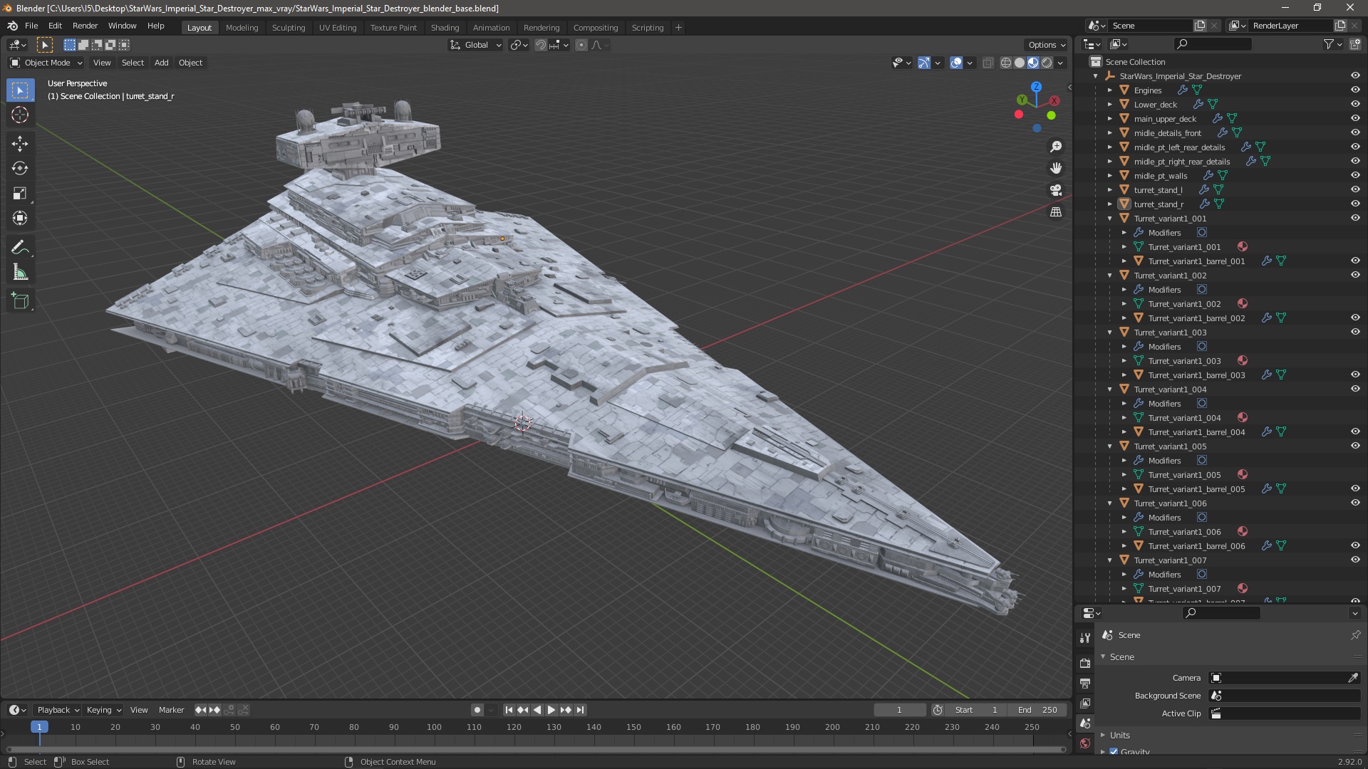 StarWars Imperial Star Destroyer is a 3d model of fictional starship in the Star Wars universe. It is a massive warship used by the Galactic Empire in the Star Wars franchise. The Imperial Star Destroyer is known for its iconic dagger-shaped design, with a long central hull and pointed bridge tower at the front. These starships are heavily armed and equipped with advanced technology, making them formidable in battle. Imperial Star Destroyers are often seen in the original Star Wars trilogy, particularly in scenes involving the Empire's military presence. For cinematography, animation, film festivals, film projects, video VR games, entertaining, promotional and advertising projects. StarWars Imperial Star Destroyer is a high quality, photo real 3d model that will enhance detail and realism to any of your rendering projects. The model has a fully textured, detailed design that allows for close-up renders, and was originally modeled in 3ds Max 2020 and rendered with V-Ray. Renders have no postprocessing! Hope you like it! ***** Features: - High quality polygonal model, has real dimensions. Easy to merge into your scene. - Units: cm - The model was created with the optimal number of polygons. (The Meshsmooth modifier is assigned to the original mesh. Easy to increase mesh resolution if necessary.) - All the objects come with complete UVs All textures and materials are included and mapped. (All colors can be easily modified.) - All objects are logically named and grouped for ease of objects selection and scene management. - No part-name confusion when importing several models into a scene. - No cleaning up necessary (Model does not include any backgrounds or scenes used in preview images.) - just drop model into your scene. - No special plugin needed to open scene. - PBR Materials ***** File Formats: - 3ds Max - Cinema 4D - Maya - Blender - OBJ, 3DS, FBX ***** Textures Formats: - 26 png (8192X8192) ***** 3d Molier International is a team of 3D artists with over a 15 years of experience. The company participated in various projects allowing us to learn our clients needs. Every model we build goes through thorough Quality assessment both visual and technical to make sure the assets look realistic and the models are of the best quality, which you can tell by looking at the renders - none of the has any postprocessing. We produce 3D models. This is our main activity. Our goal is to create a 3D copy of all objects on the world. Buy 3D models from professionals! Also check out our other models, just click on our user name to see complete gallery. (c) 3d_molier International - 2025