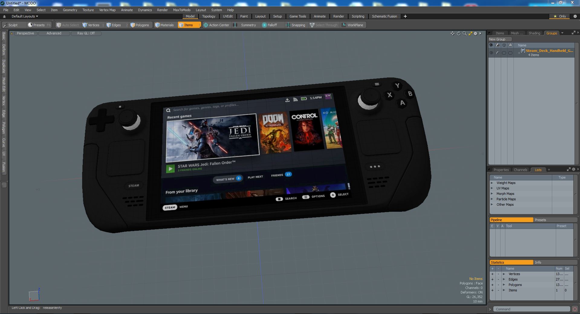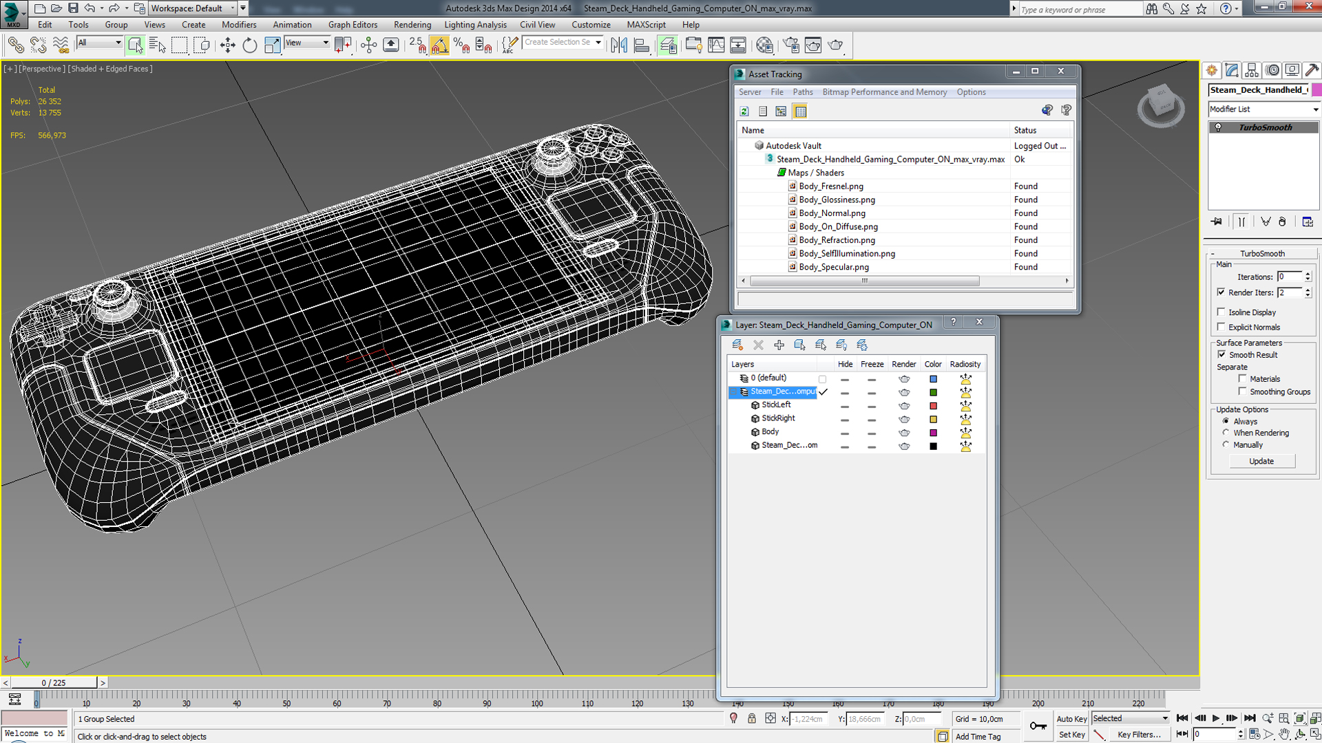 Steam Deck Handheld Gaming Computer ON is a high quality, photo real 3d model that will enhance detail and realism to any of your rendering projects. The model has a fully textured, detailed design that allows for close-up renders, and was originally modeled in 3ds Max 2020 and rendered with V-Ray. Renders have no postprocessing!