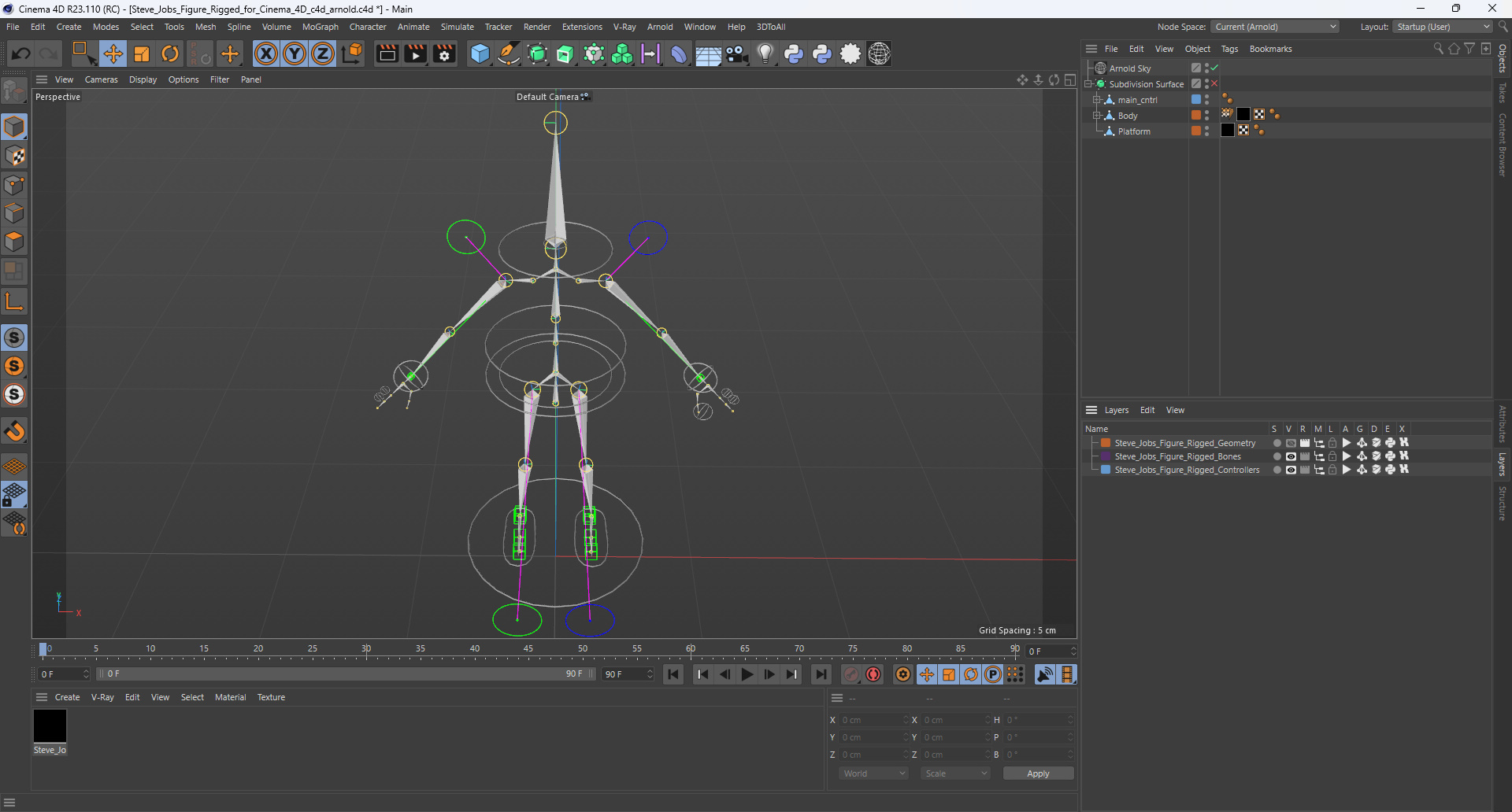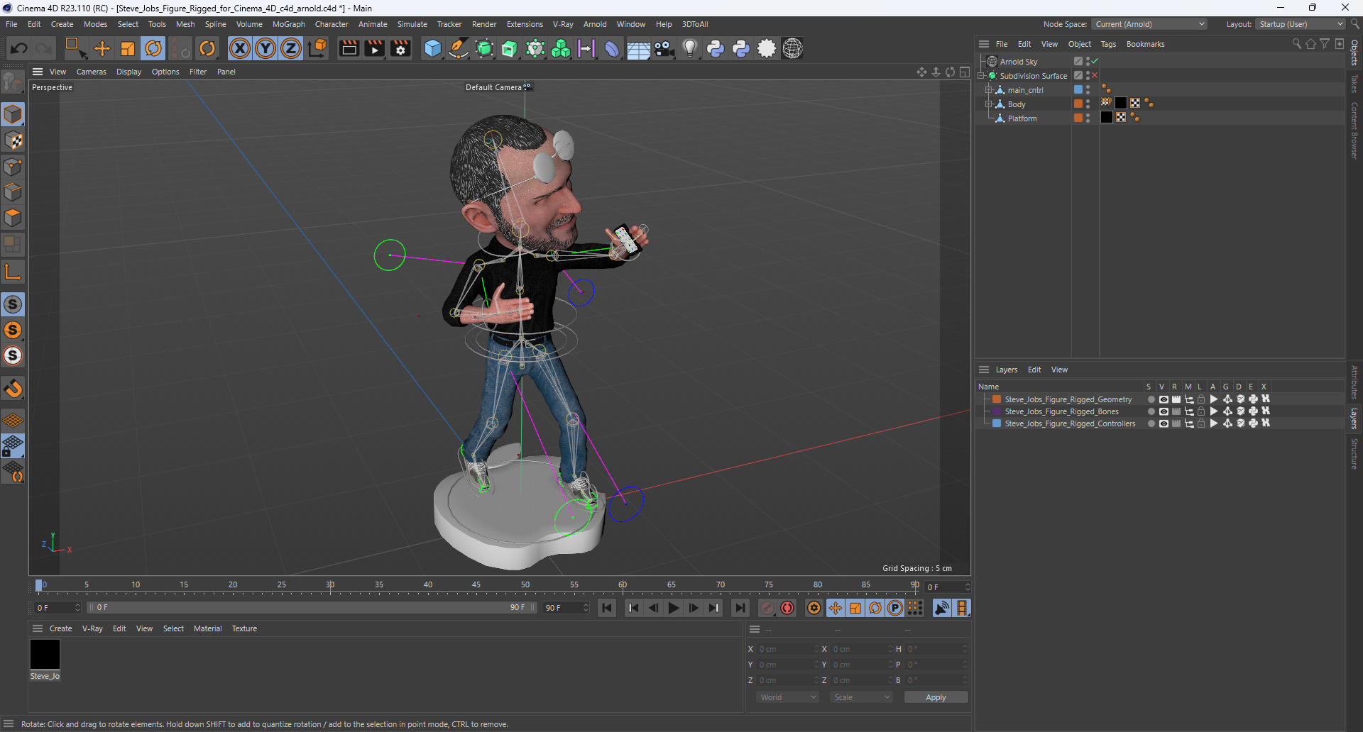 Steve Jobs Figure Rigged for Cinema 4D is fully rigged and is ready to be animated in Cinema 4D. You can easily position it the way you need or animate it the way your project requires. See the screenshots to get an idea of how rigging works. The pose of the model on the render images is an example and can be recreated using rig, it is not initially included into the product.