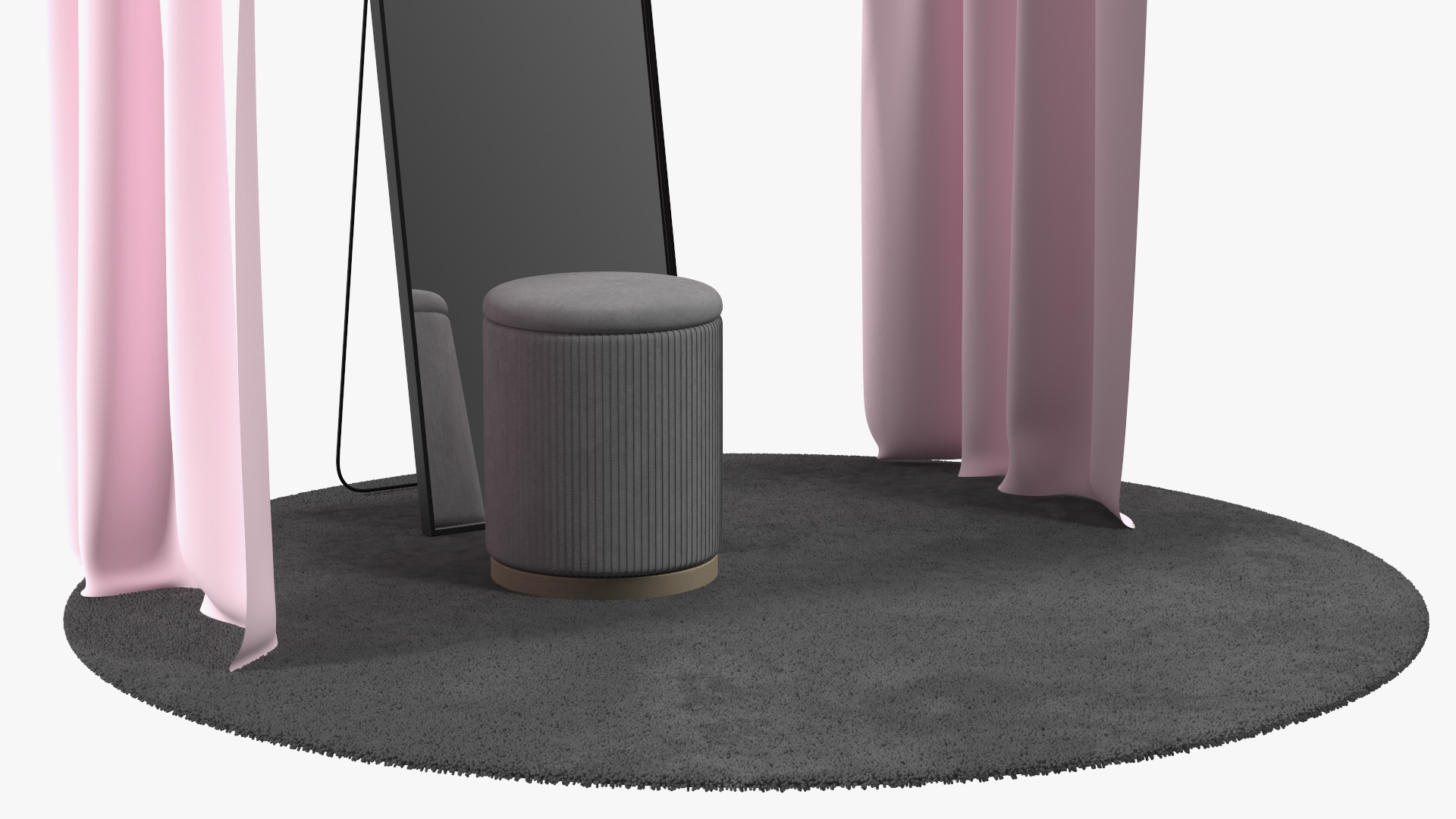 Store Dressing Room Pink Open Fur is a 3D model of boutique or clothing store facility, which is a fitting room set with curtain, mirror, ottoman stool, and carpet (round rag).
