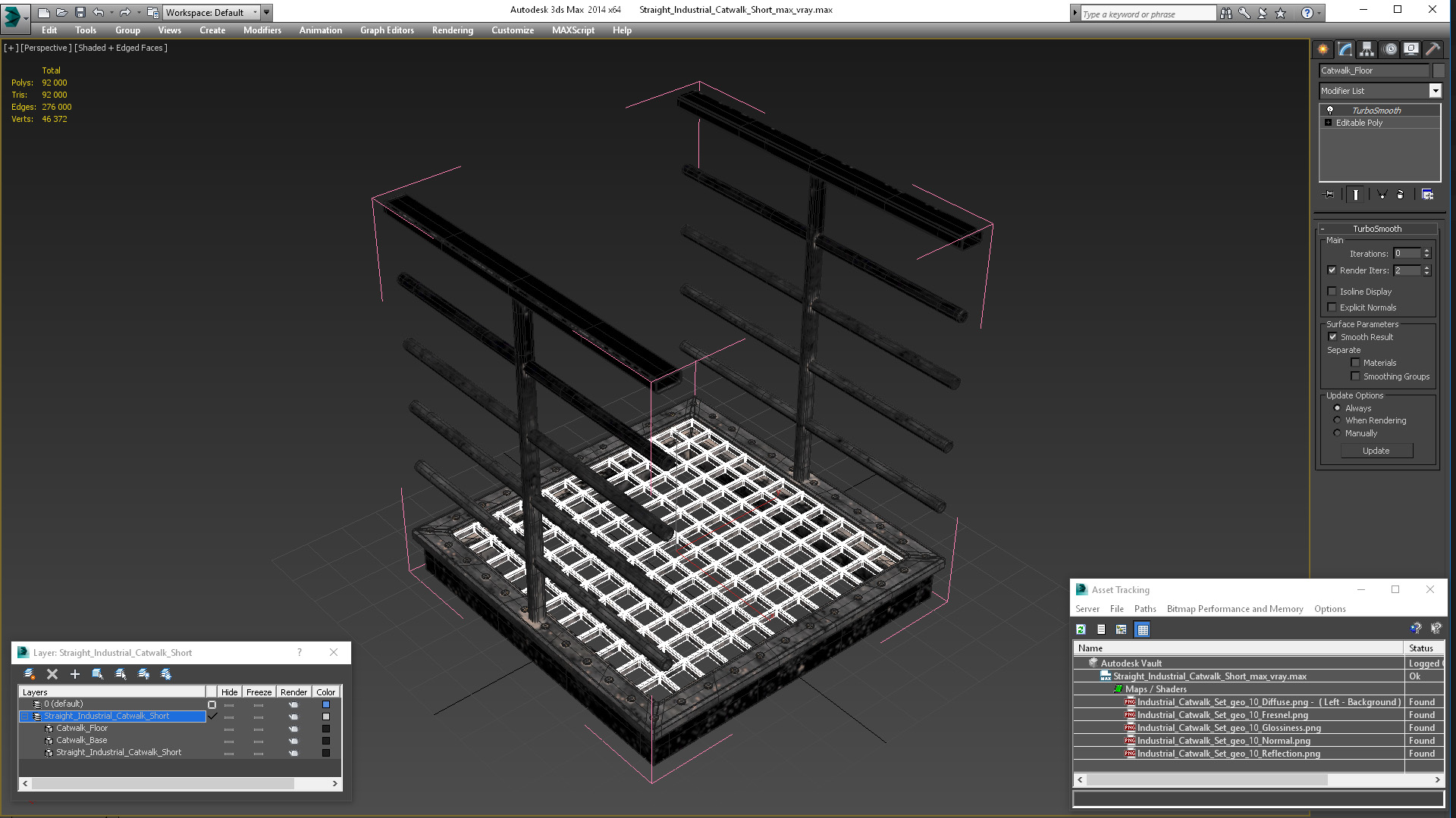 Straight Industrial Catwalk Short is a high quality, photo real 3d model that will enhance detail and realism to any of your rendering projects. The model has a fully textured, detailed design that allows for close-up renders, and was originally modeled in 3ds Max 2020 and rendered with V-Ray. Renders have no postprocessing!