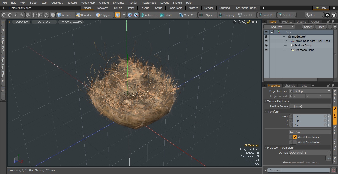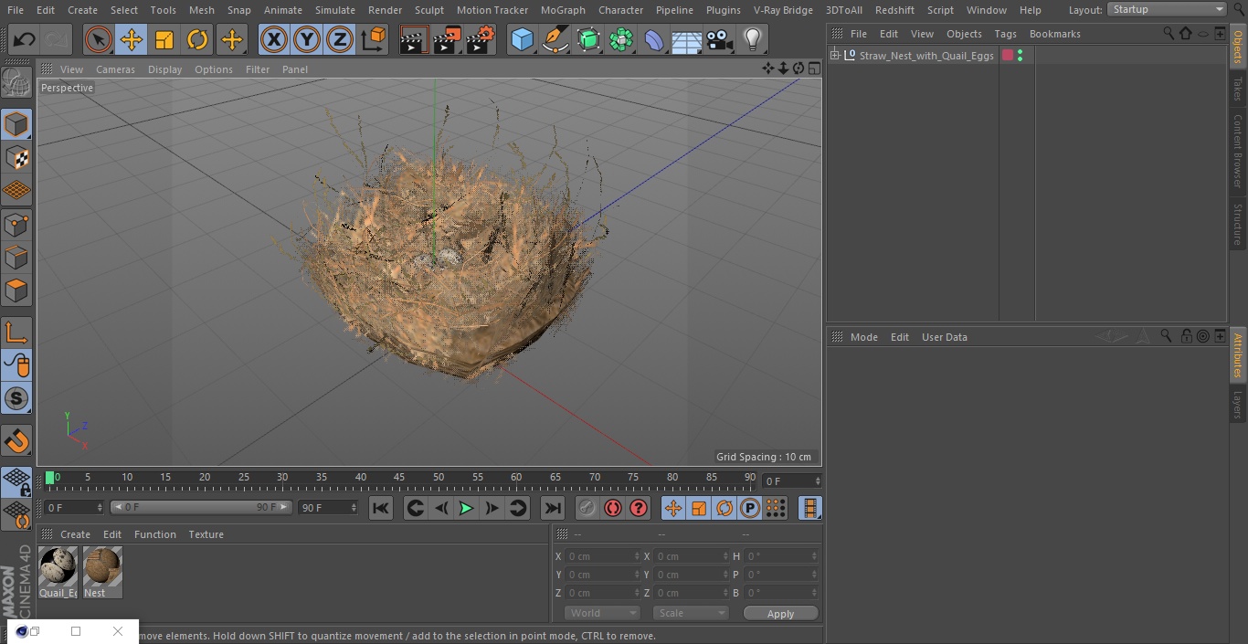 Straw Nest with Quail Eggs is a 3D model of authentic straw nest holding tiny quail eggs set, which is a rural farming prop.