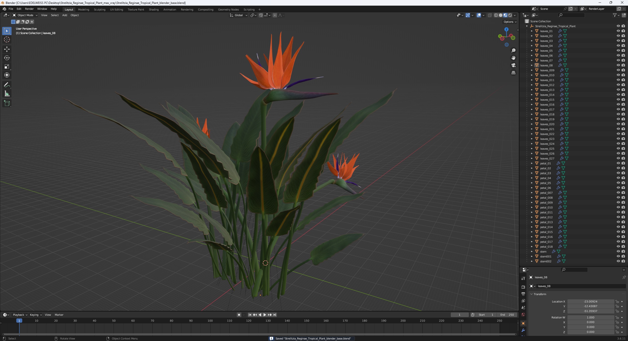 Strelitzia Reginae Tropical Plant is a high quality, photo real 3d model that will enhance detail and realism to any of your rendering projects. The model has a fully textured, detailed design that allows for close-up renders, and was originally modeled in 3ds Max 2020 and rendered with V-Ray. Renders have no postprocessing!