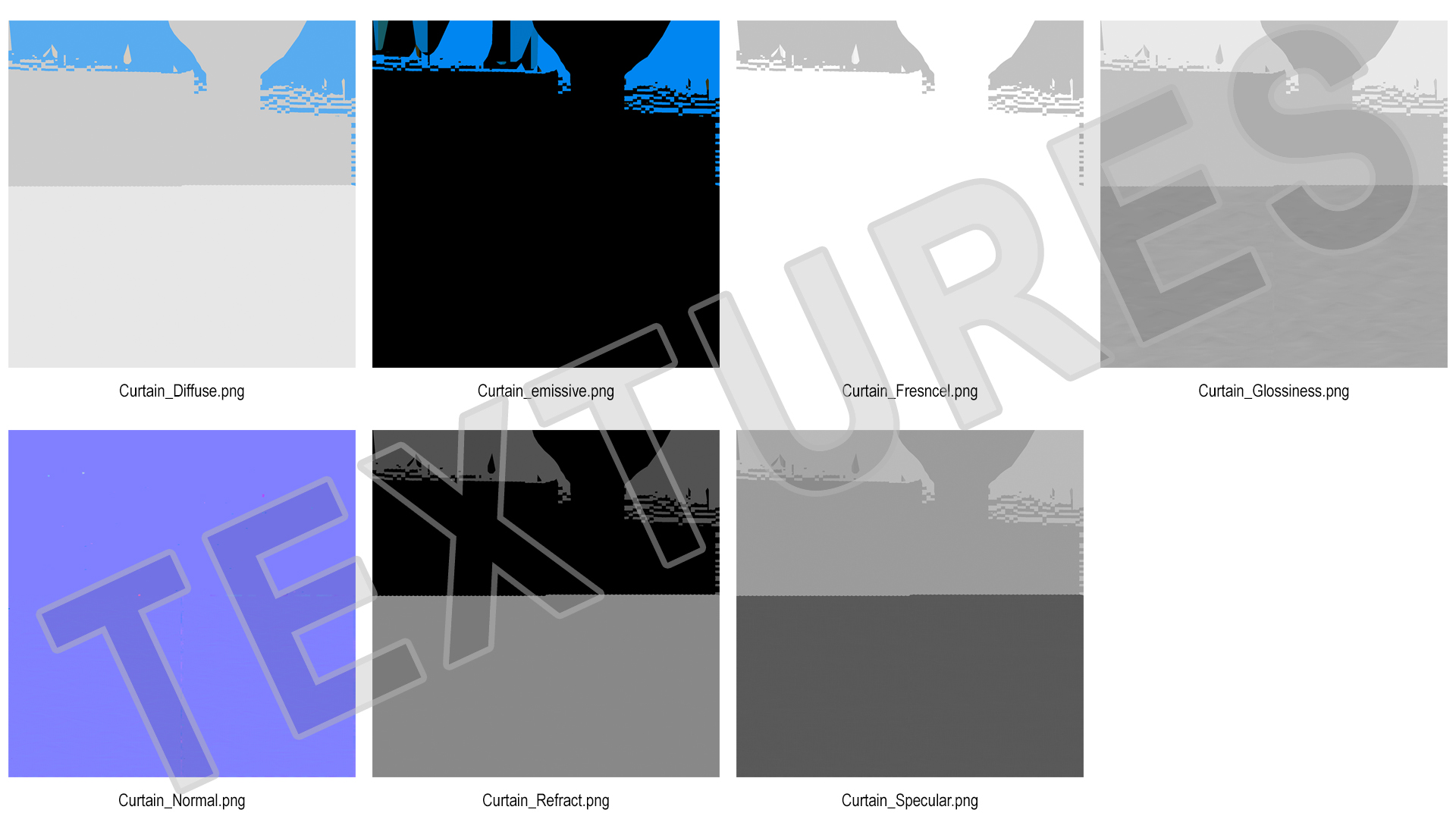 All textures and materials are included and mapped. (All colors can be easily modified.)