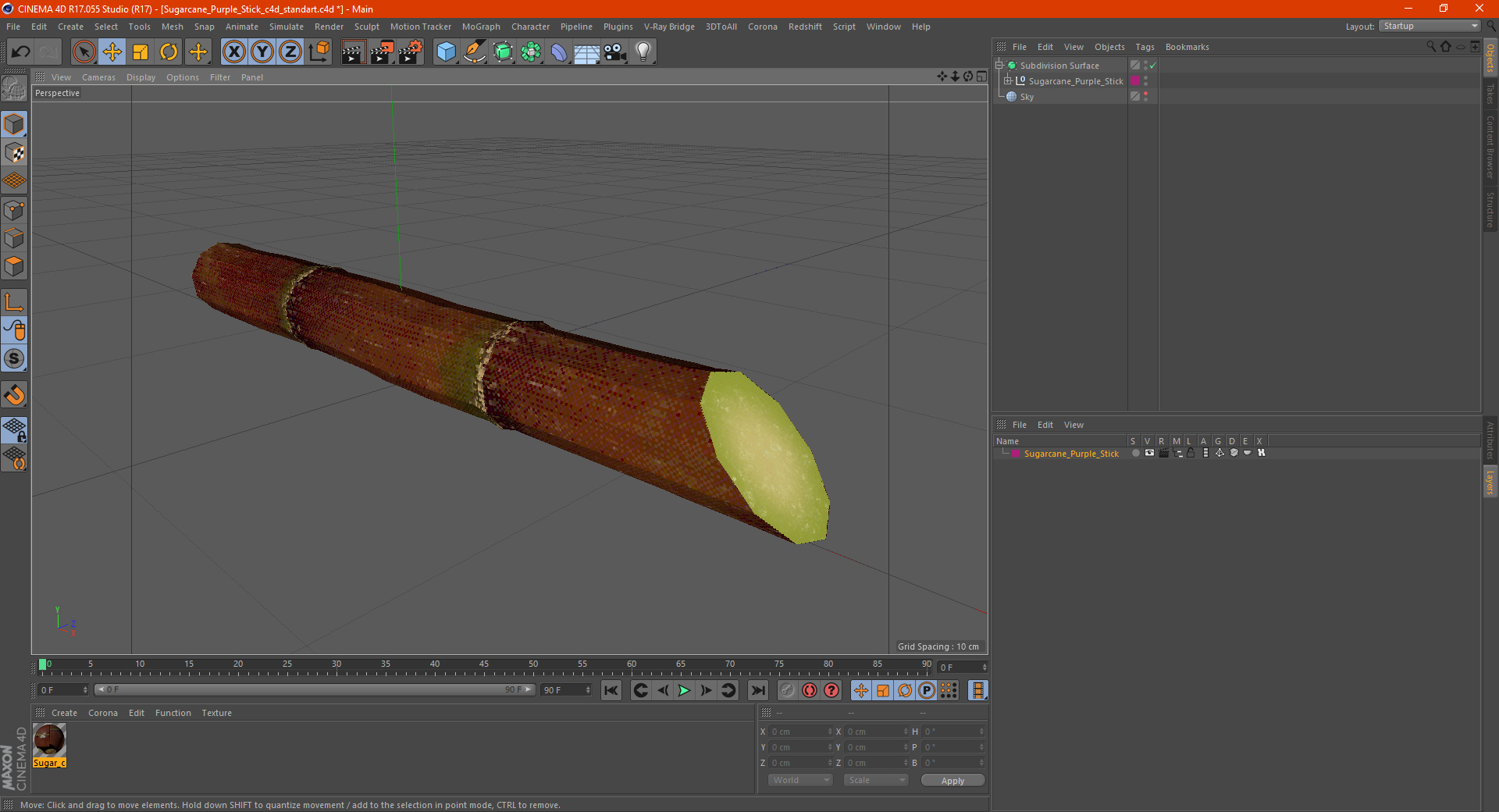 Sugarcane Purple Stick is a three-dimensional model of a sugar cane piece of perennial, tall grass that used for sugar production and more.