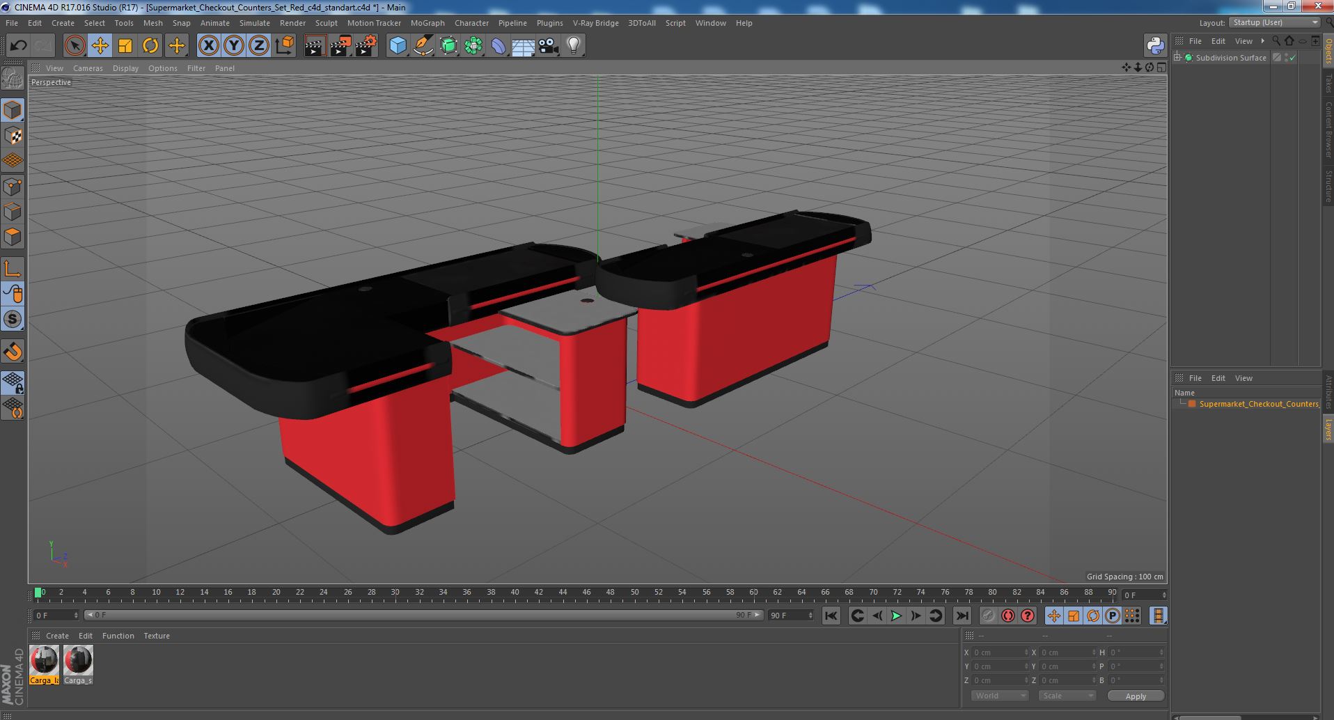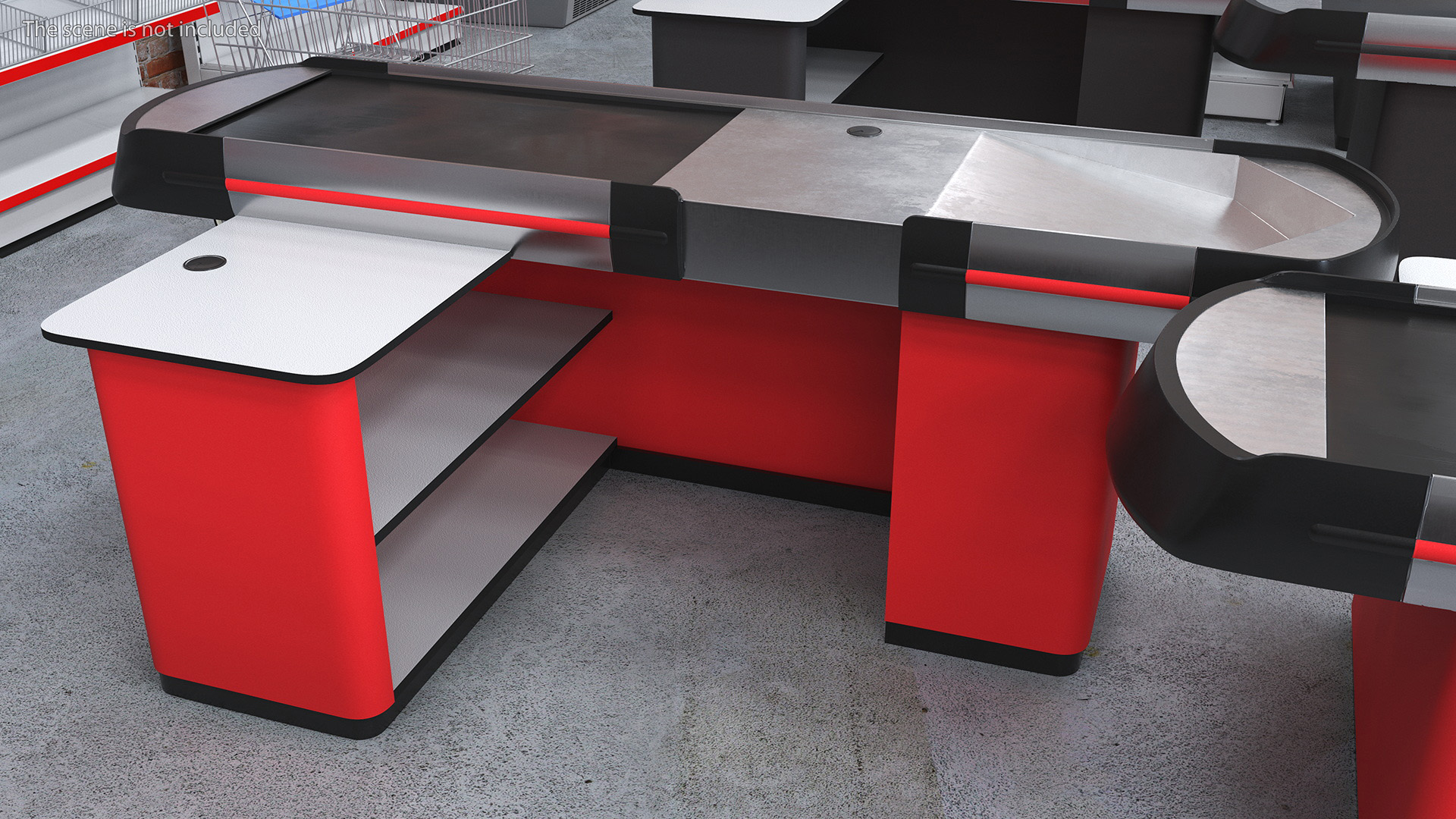 Supermarket Checkout Counters Set Red is a three-dimensional model of pair of checkout counters with conveyor belt items which features a modern design with an integrated conveyor belt for efficient scanning and bagging of items at retail points of sale.