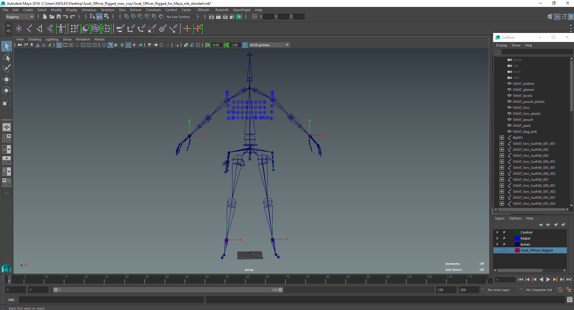 Swat Officer Rigged for Maya is fully rigged and is ready to be animated in Maya. You can easily position it the way you need or animate it the way your project requires. See the screenshots to get an idea of how rigging works. The pose of the model on the render images is an example and can be recreated using rig, it is not initially included into the product.