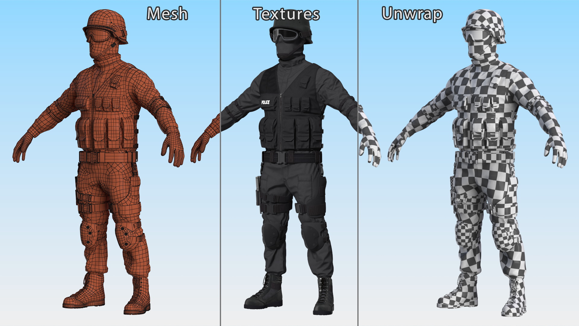 SWAT Police Officer Tactical Gear is a high quality, photo real 3d model that will enhance detail and realism to any of your rendering projects. The model has a fully textured, detailed design that allows for close-up renders, and was originally modeled in 3ds Max 2020 and rendered with V-Ray. Renders have no postprocessing!