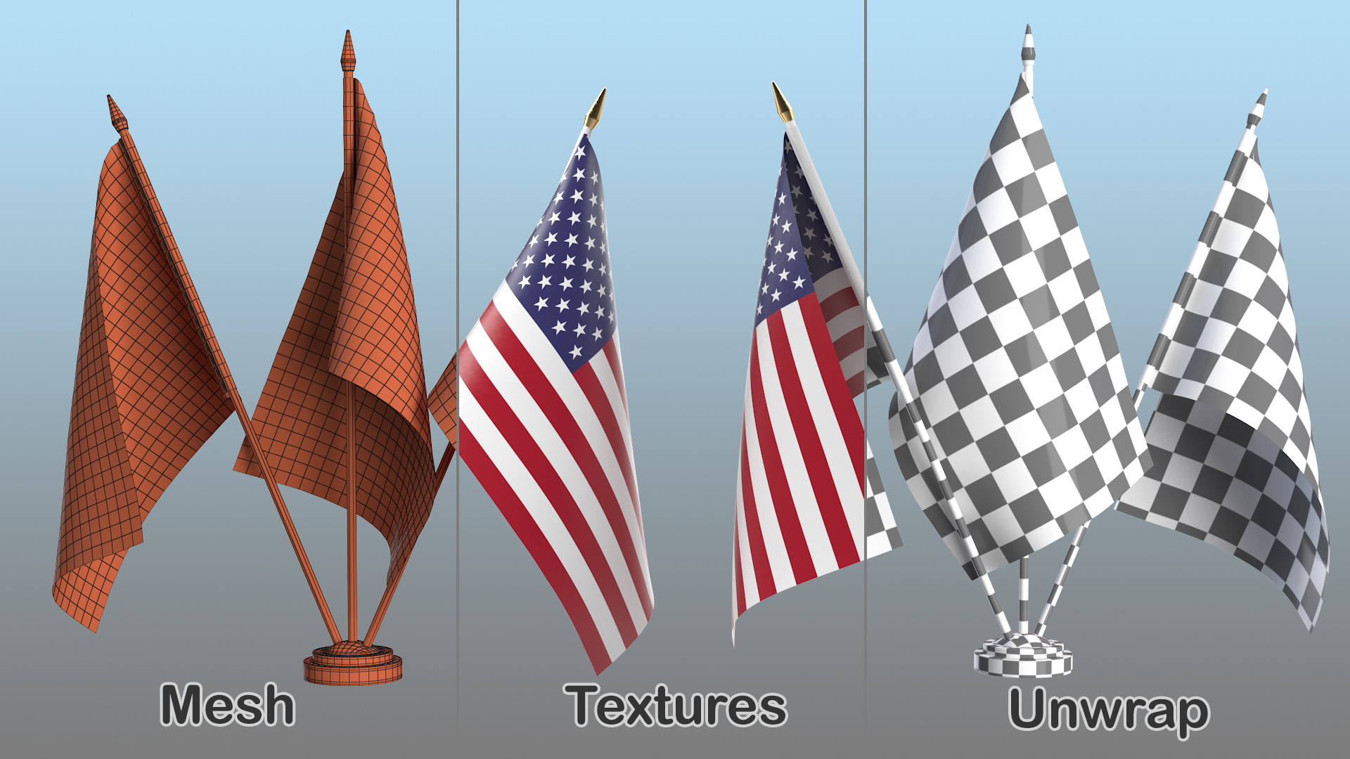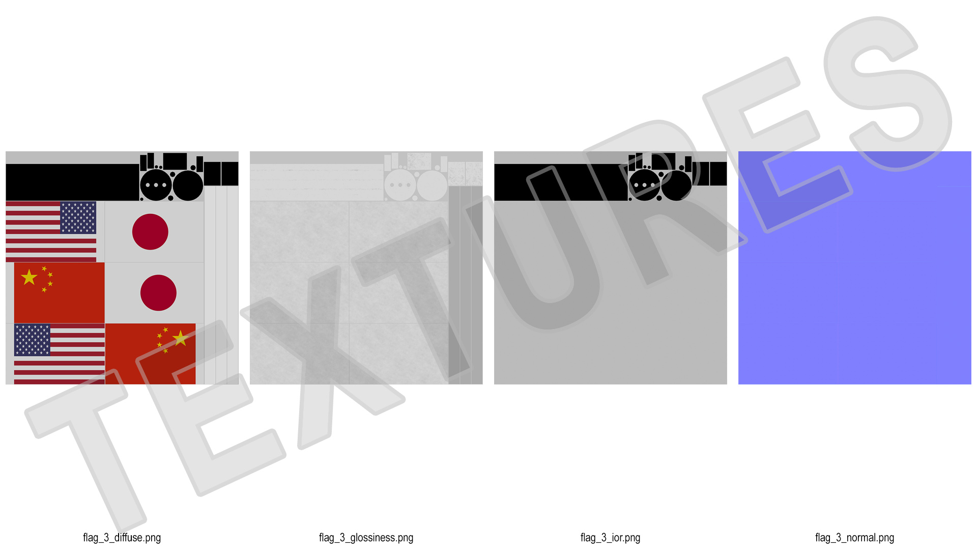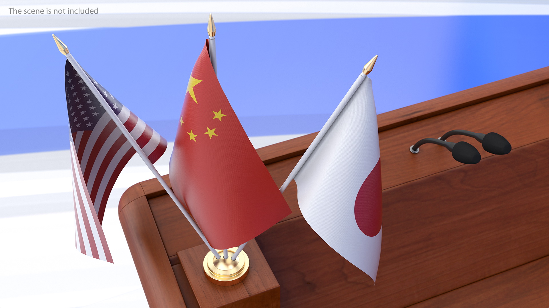 Table Flags USA China Japan is a high quality, photo real 3d model that will enhance detail and realism to any of your rendering projects. The model has a fully textured, detailed design that allows for close-up renders, and was originally modeled in 3ds Max 2020 and rendered with V-Ray. Renders have no postprocessing!