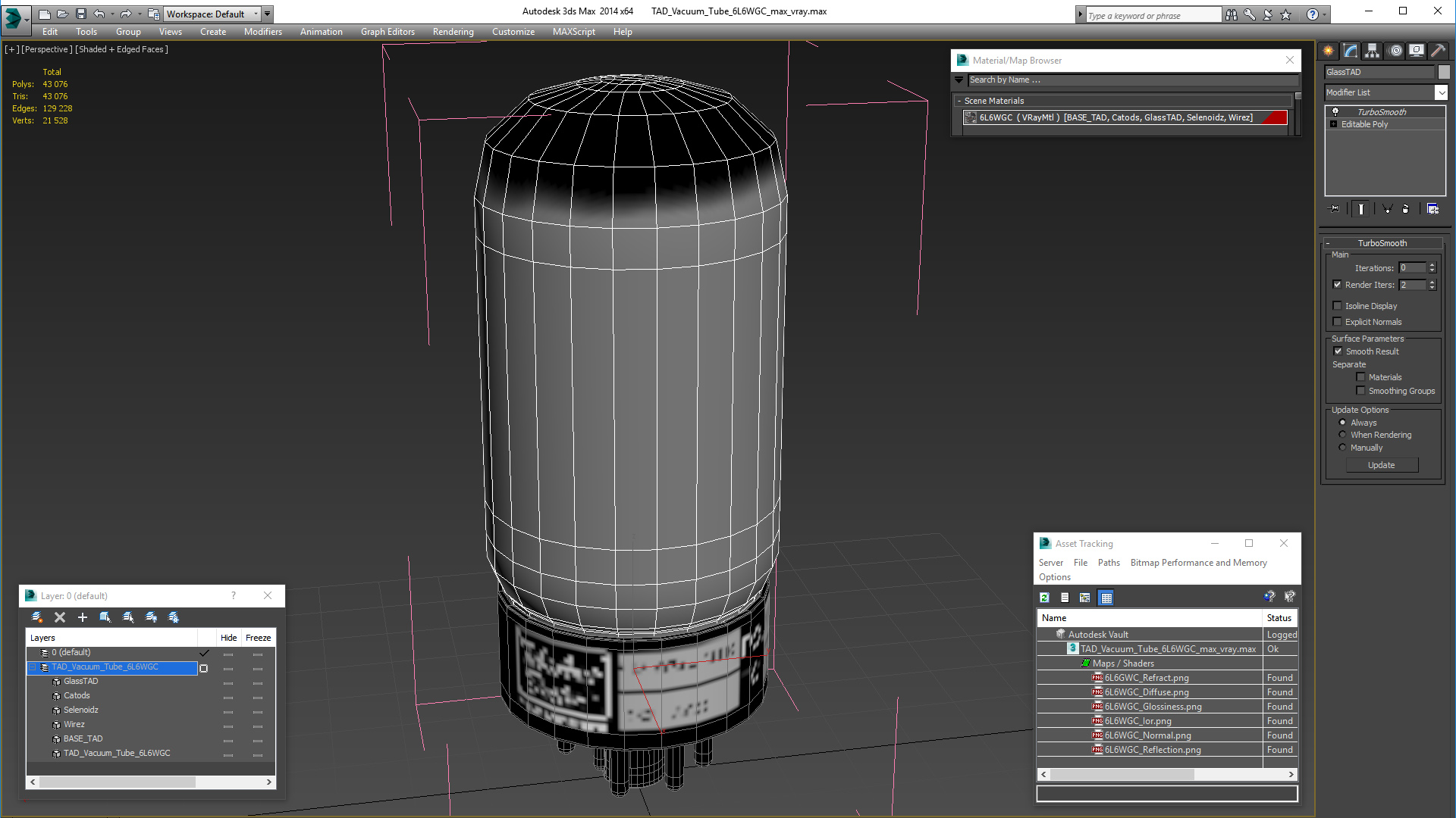 TAD Vacuum Tube 6L6WGC is a high quality, photo real 3d model that will enhance detail and realism to any of your rendering projects. The model has a fully textured, detailed design that allows for close-up renders, and was originally modeled in 3ds Max 2020 and rendered with V-Ray. Renders have no postprocessing!