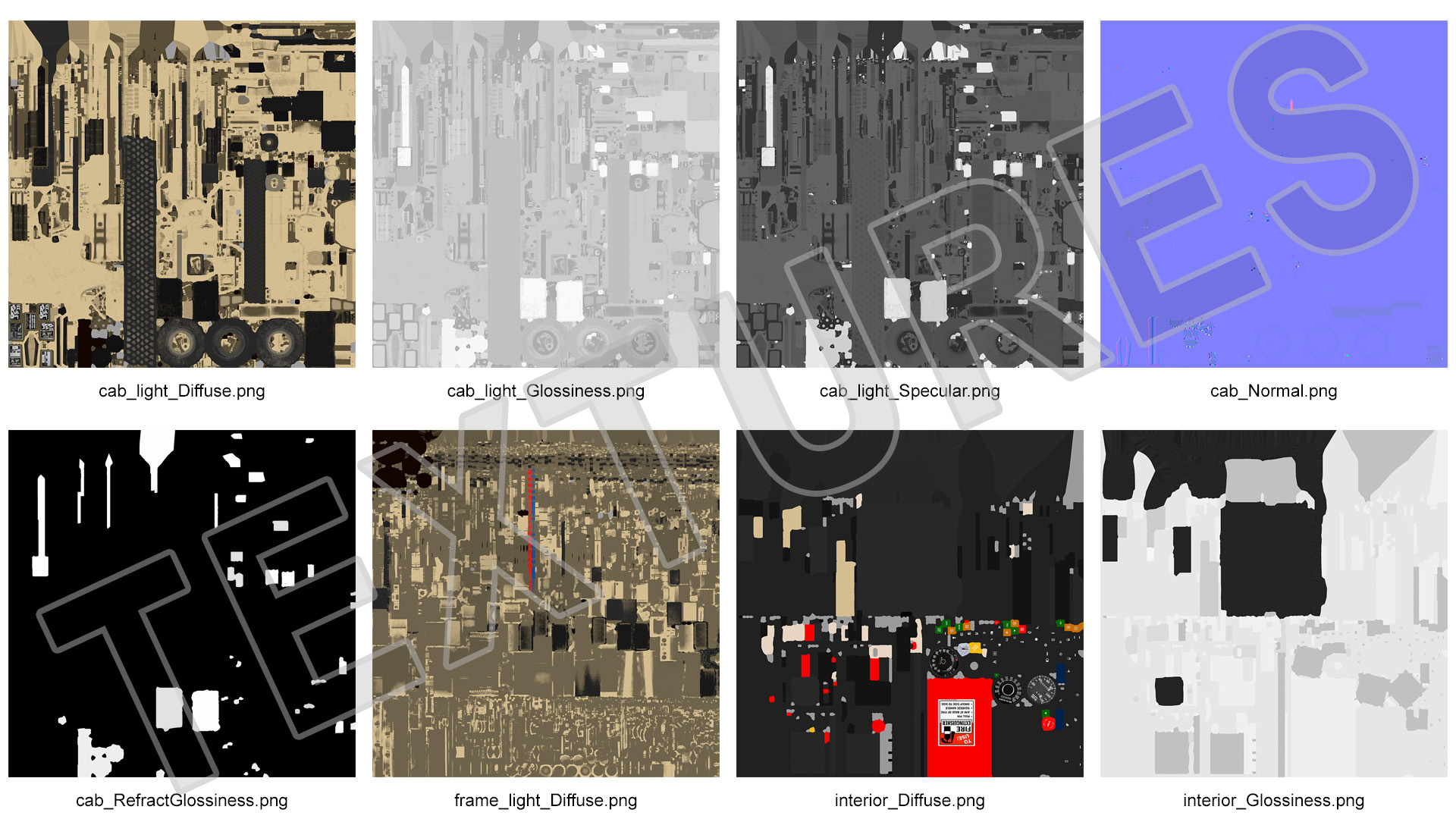 All textures and materials are included and mapped. (All colors can be easily modified.)