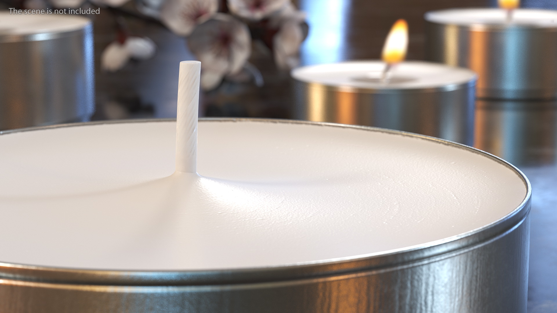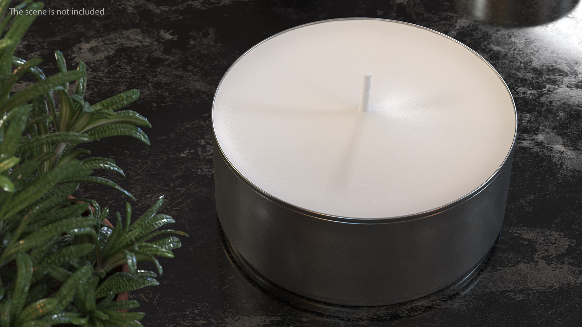 Tealight Candle in Metal Cup is a three-dimensional model of a small lighting device which is a candle in a thin metal cup.
