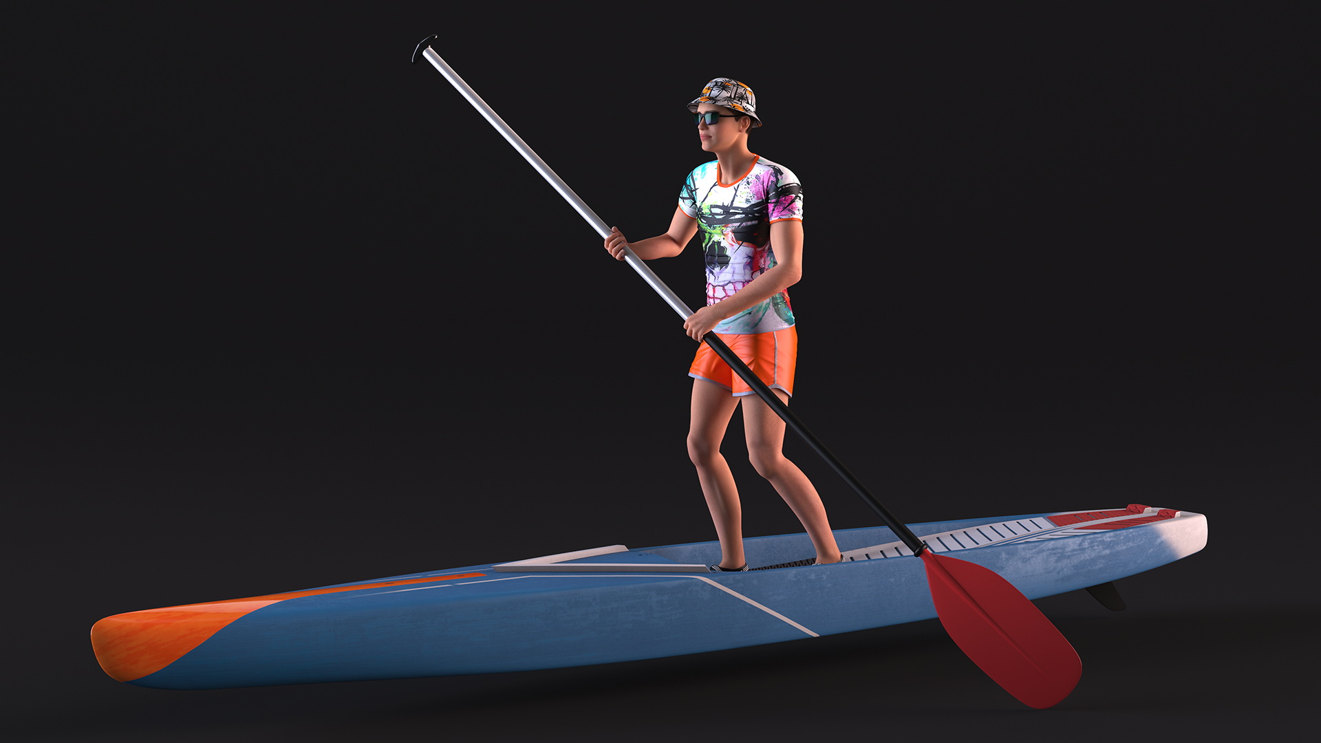 Teen Boy Swimwear on Race SUP Board is a three-dimensional model of young male athlete with sporting equipment which is designed for the standup paddleboarding (SUP), which is a popular water sport born from surfing with modern roots in Hawaii.