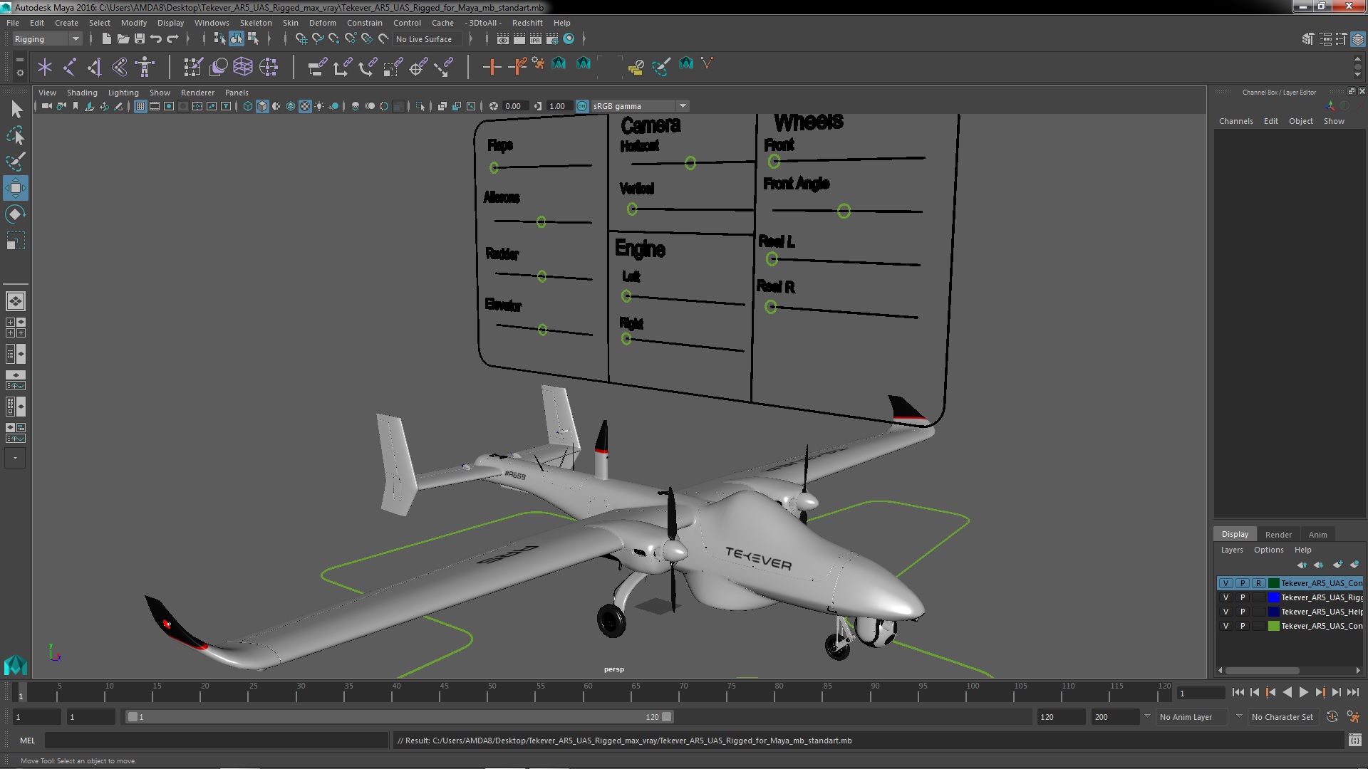 Tekever AR5 UAS Rigged for Maya is fully rigged and is ready to be animated in Maya. You can easily position it the way you need or animate it the way your project requires. See the screenshots to get an idea of how rigging works. The pose of the model on the render images is an example and can be recreated using rig, it is not initially included into the product.