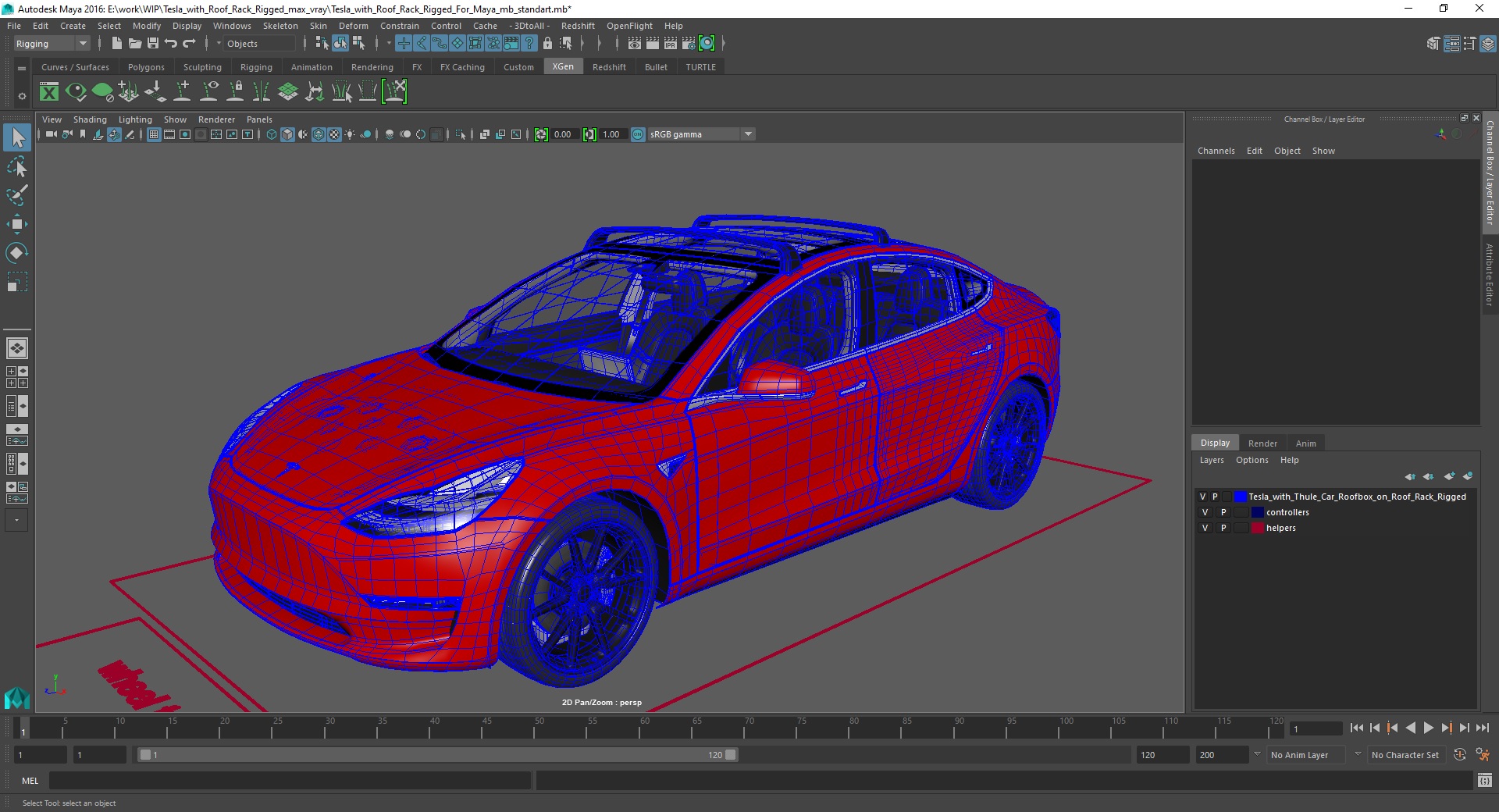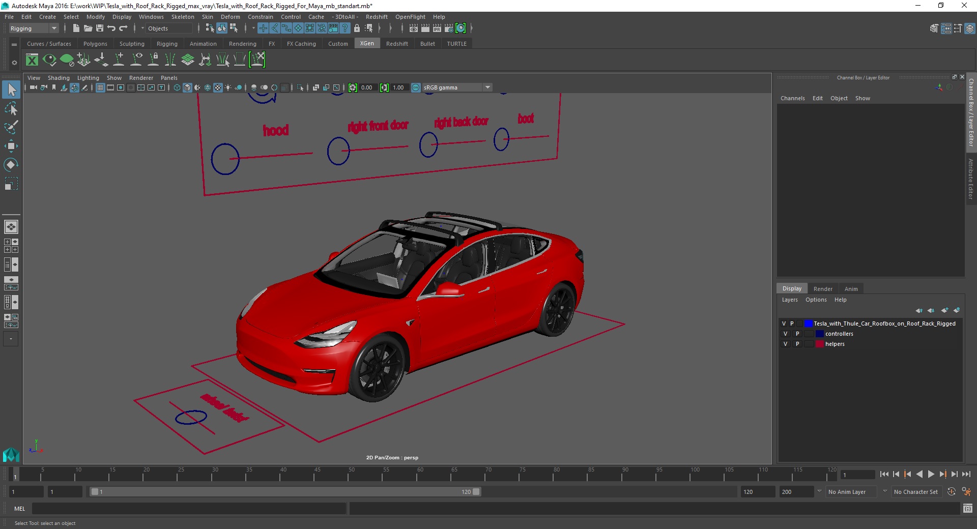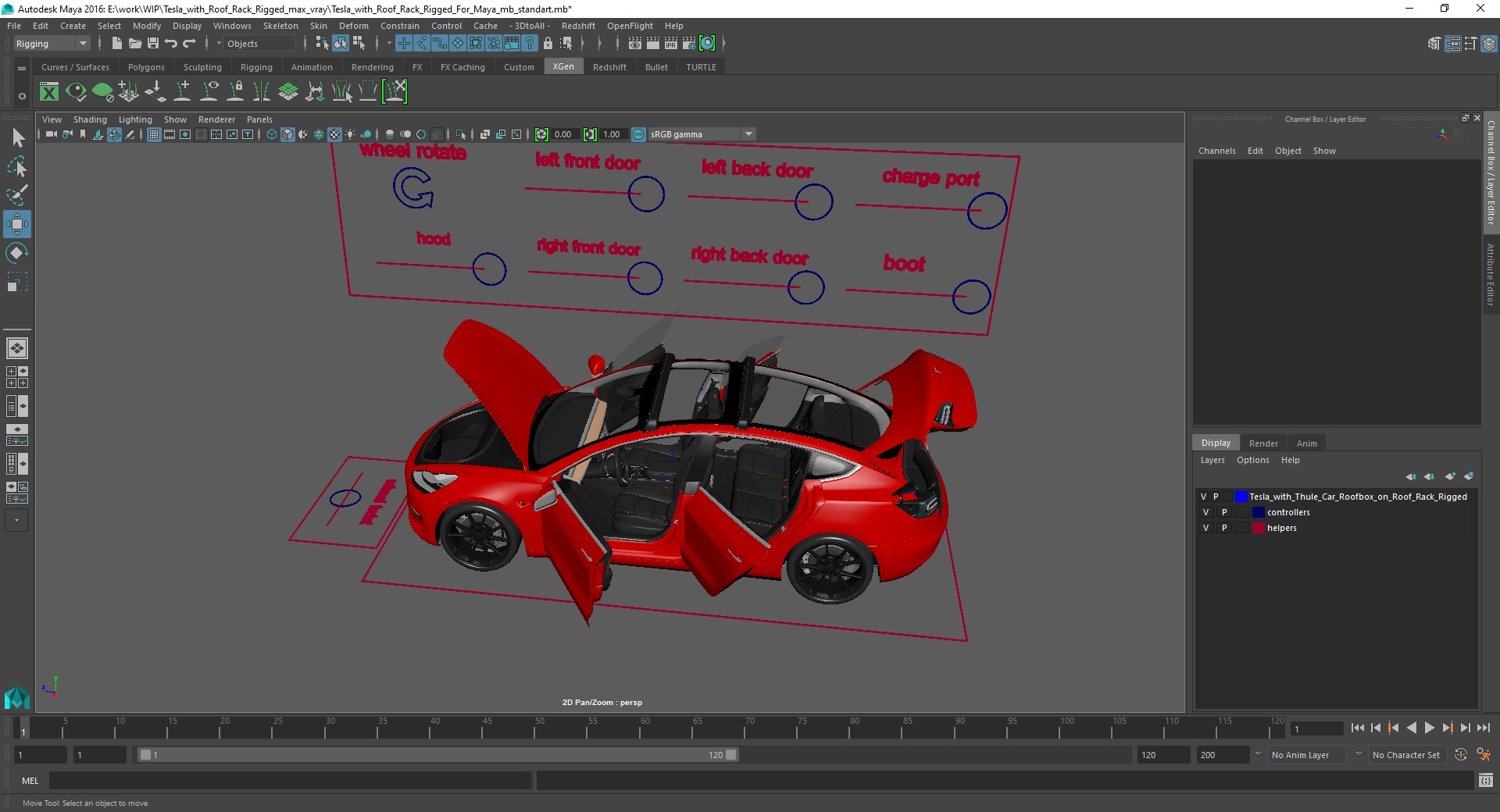 Tesla with Roof Rack Rigged for Maya is fully rigged and is ready to be animated in Maya. You can easily position it the way you need or animate it the way your project requires. See the screenshots to get an idea of how rigging works. The pose of the model on the render images is an example and can be recreated using rig, it is not initially included into the product.