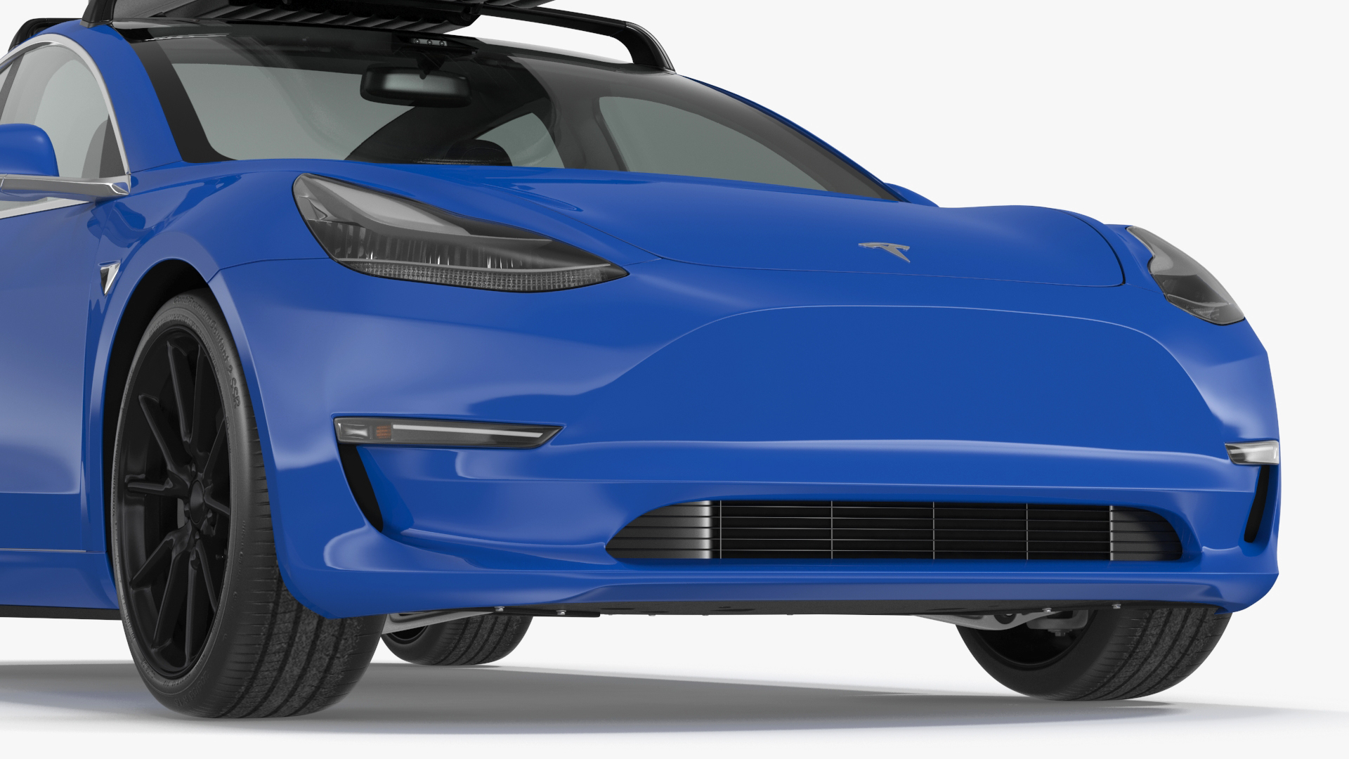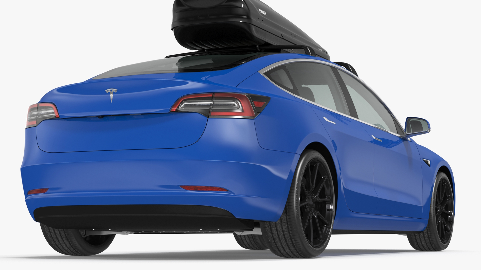 Tesla with Thule Car Roofbox on Roof Rack is a three-dimensional model of Tesla Model 3 car with roofbox on roof rack which is an automotive accessory which designed to transport extra cargo, and which is mounted on the roof of a car for provide additional storage space.