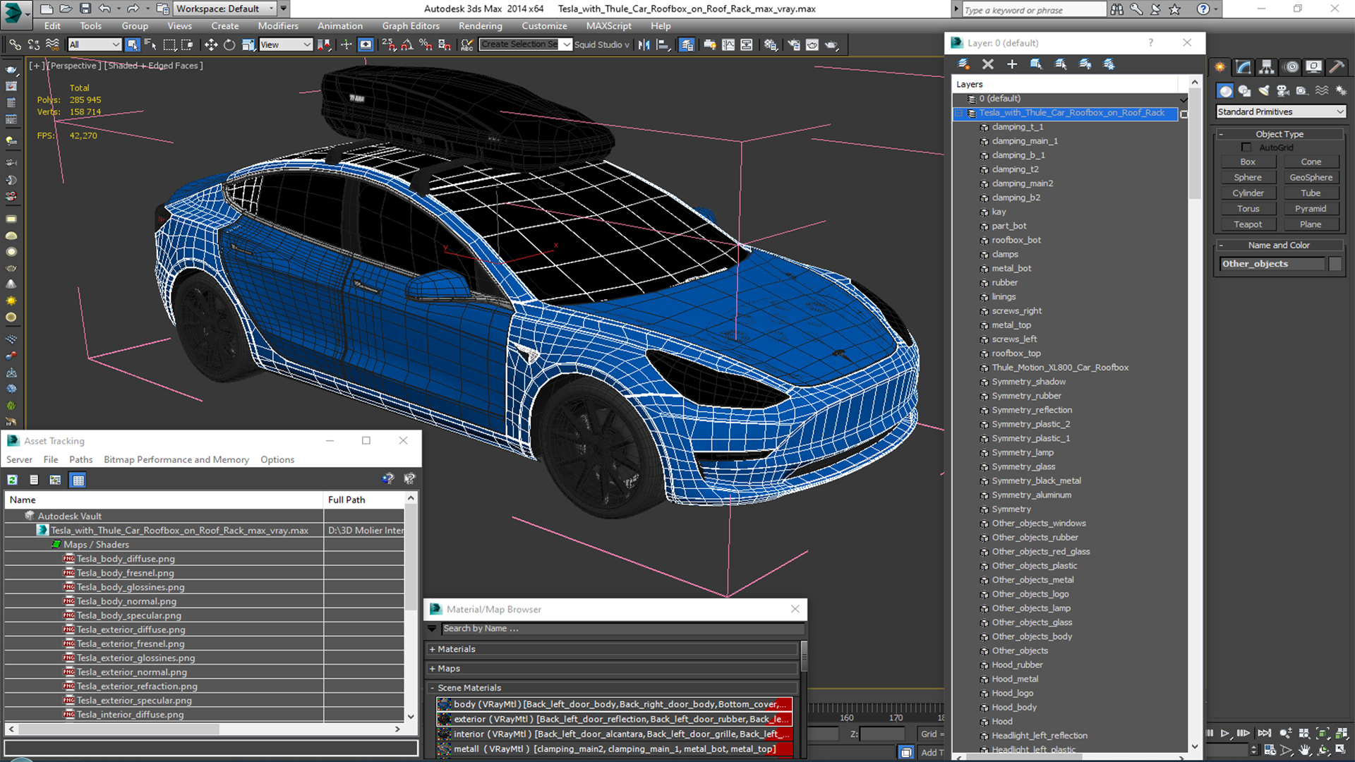Tesla with Thule Car Roofbox on Roof Rack is a high quality, photo real 3d model that will enhance detail and realism to any of your rendering projects. The model has a fully textured, detailed design that allows for close-up renders, and was originally modeled in 3ds Max 2020 and rendered with V-Ray. Renders have no postprocessing!