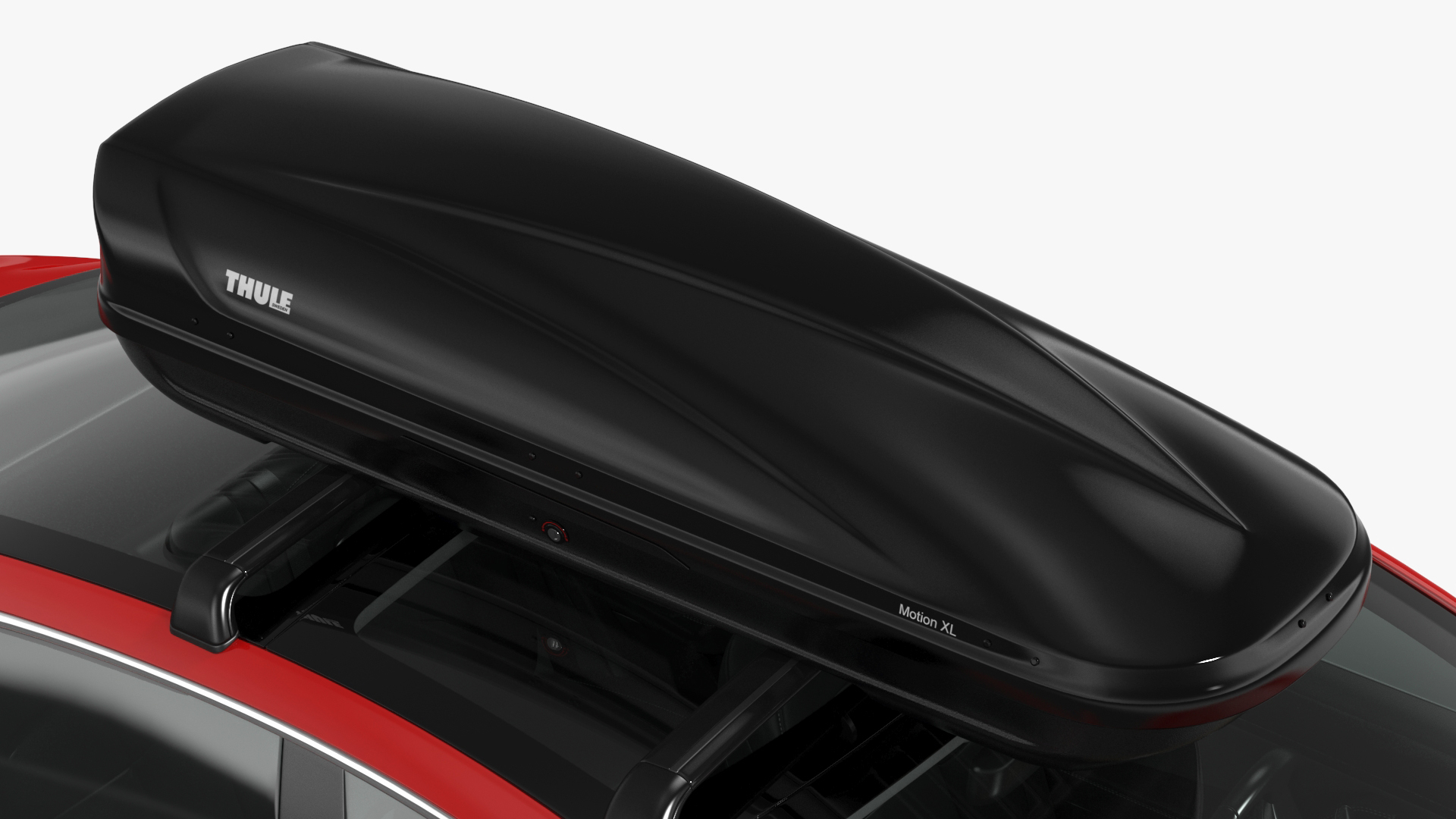 Tesla with Thule Car Roofbox on Roof Rack Rigged is a three-dimensional model of Tesla Model 3 car with roofbox on roof rack which is a popular automotive accessory which designed to transport extra cargo, and which is mounted on the roof of a car for provide additional storage space.