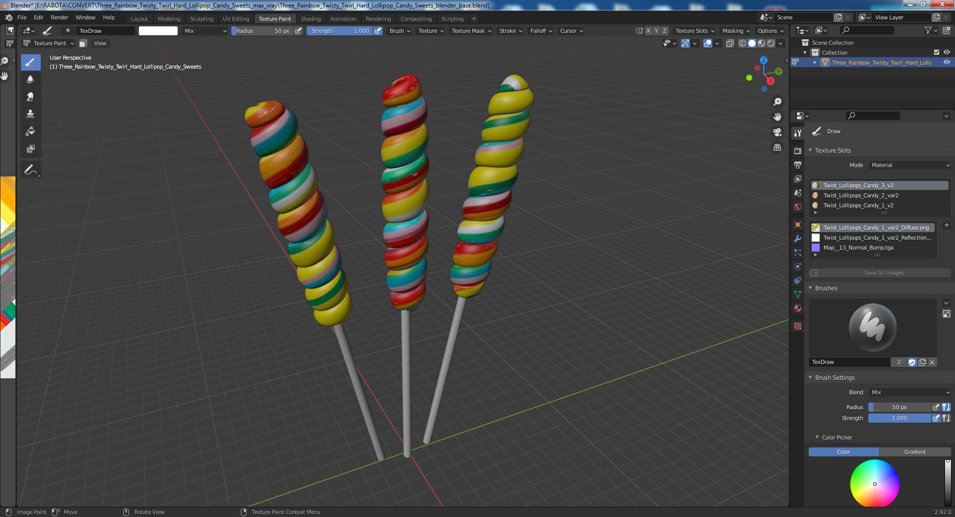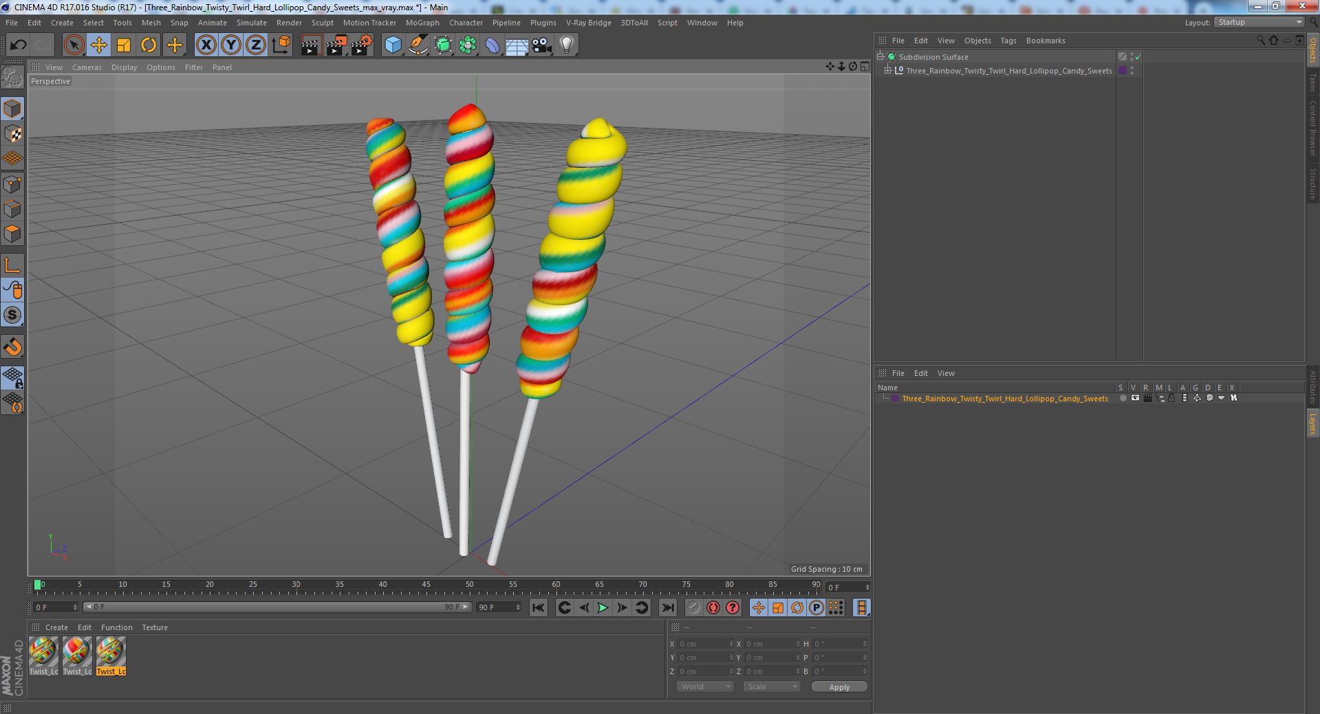 Three Rainbow Twisty Twirl Hard Lollipop Candy Sweets is a high quality, photo real 3d model that will enhance detail and realism to any of your rendering projects. The model has a fully textured, detailed design that allows for close-up renders, and was originally modeled in 3ds Max 2020 and rendered with V-Ray. Renders have no postprocessing!