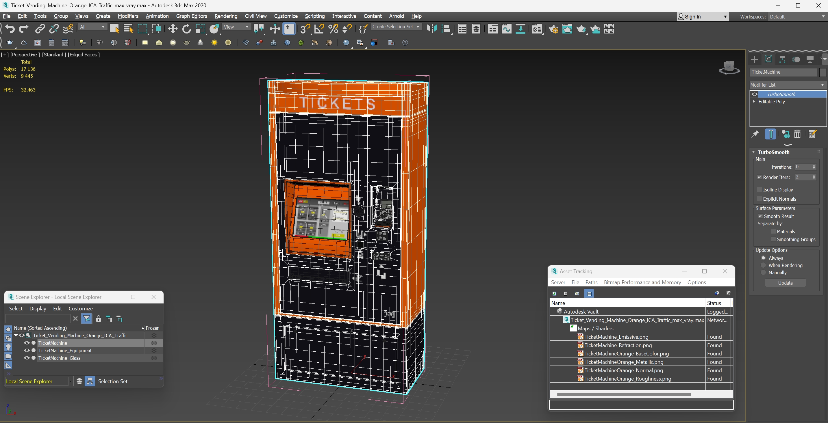 Ticket Vending Machine Orange ICA Traffic is a high quality, photo real 3d model that will enhance detail and realism to any of your rendering projects. The model has a fully textured, detailed design that allows for close-up renders, and was originally modeled in 3ds Max 2020 and rendered with V-Ray. Renders have no postprocessing!