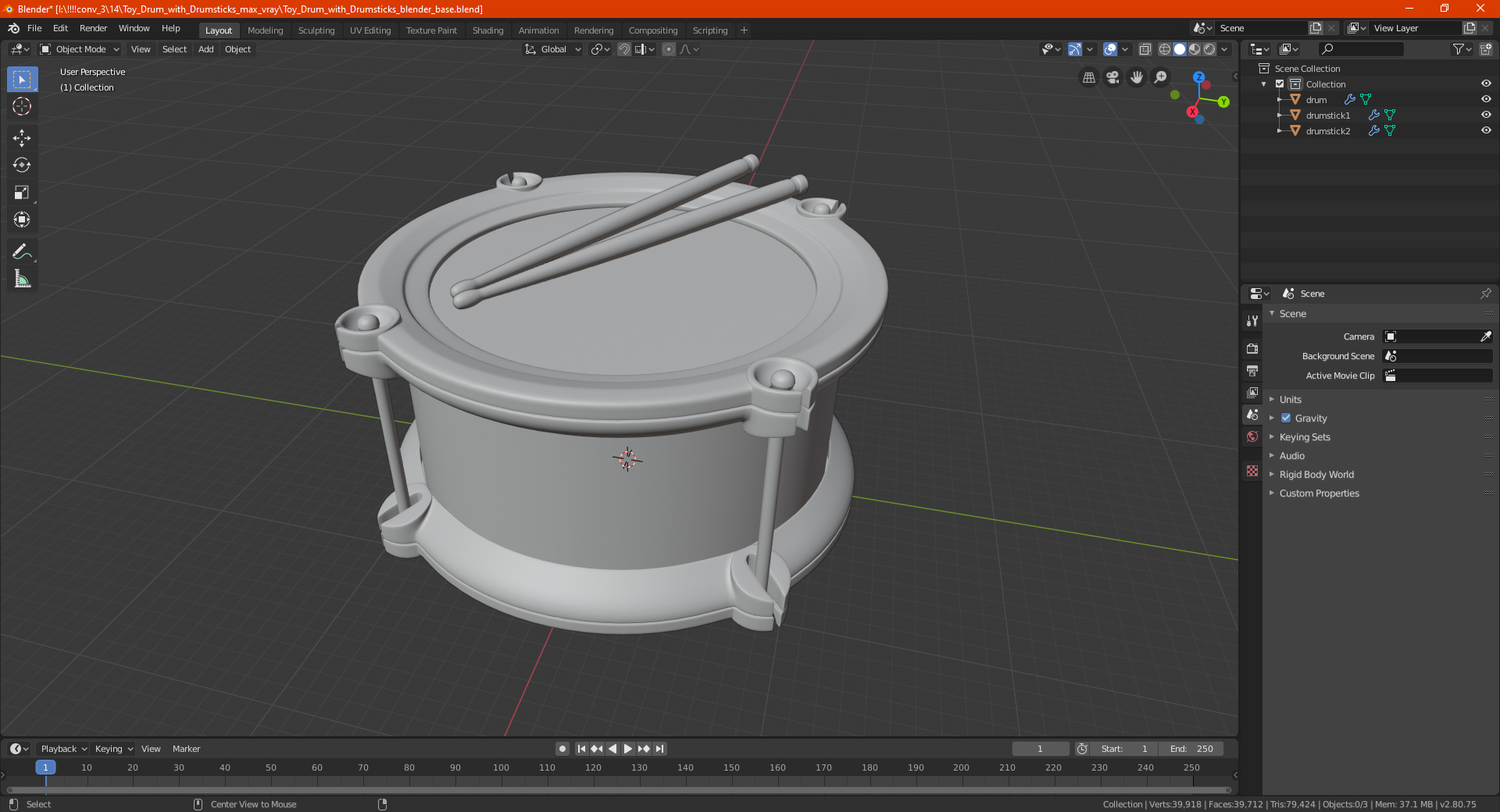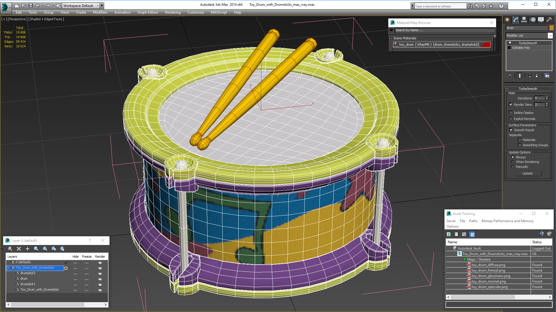 Toy Drum with Drumsticks is a high quality, photo real 3d model that will enhance detail and realism to any of your rendering projects. The model has a fully textured, detailed design that allows for close-up renders, and was originally modeled in 3ds Max 2020 and rendered with V-Ray. Renders have no postprocessing!