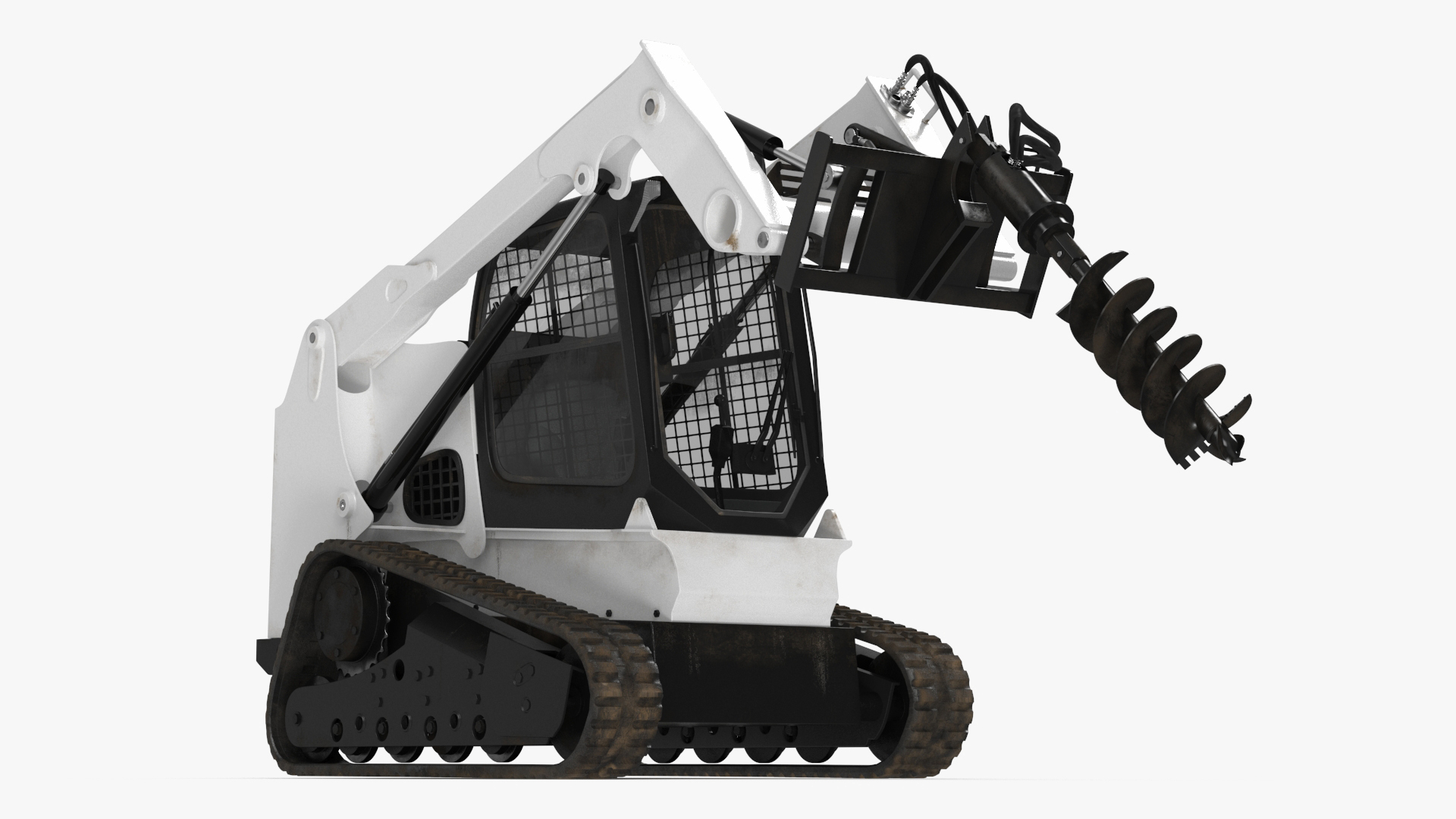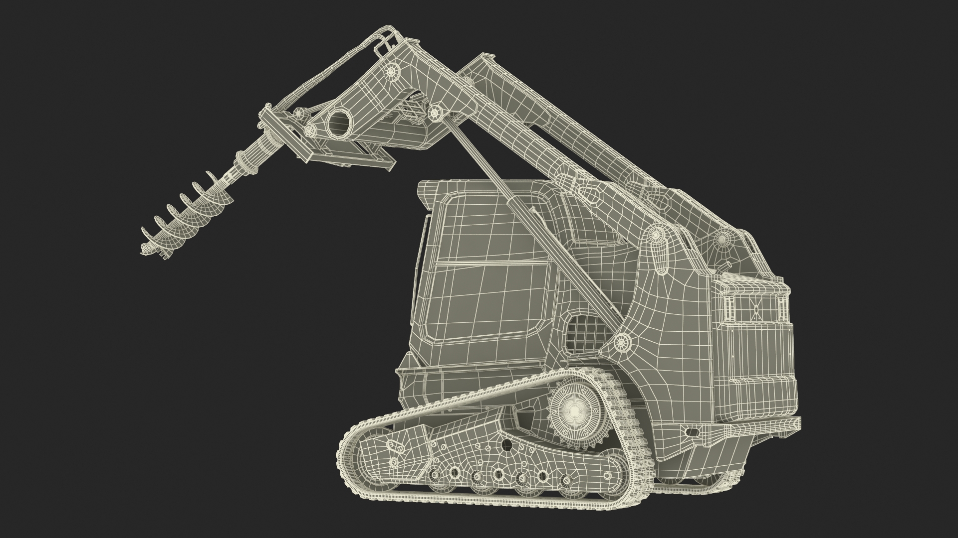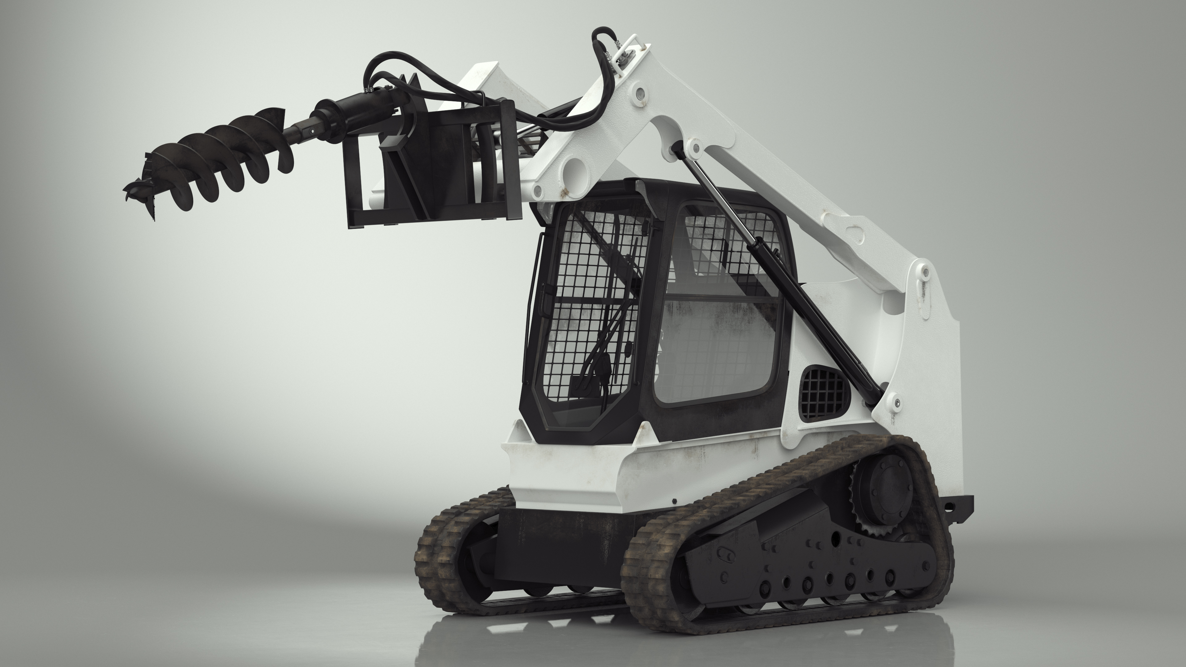 Track Skid Steer with Post Hole Auger Rigged is a 3d model of specialized piece of heavy equipment used for digging holes, typically for the purpose of installing fence posts, signposts, or other similar structures.
