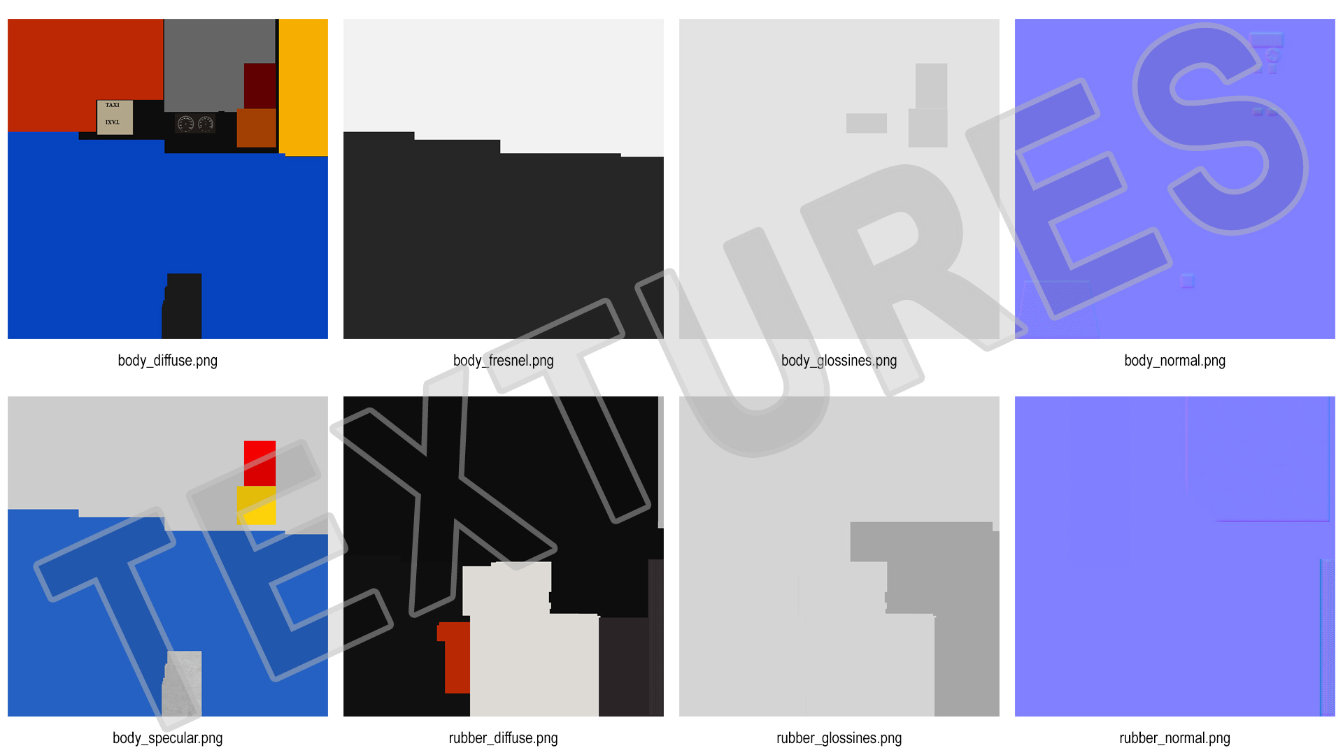 All textures and materials are included and mapped. (All colors can be easily modified.)