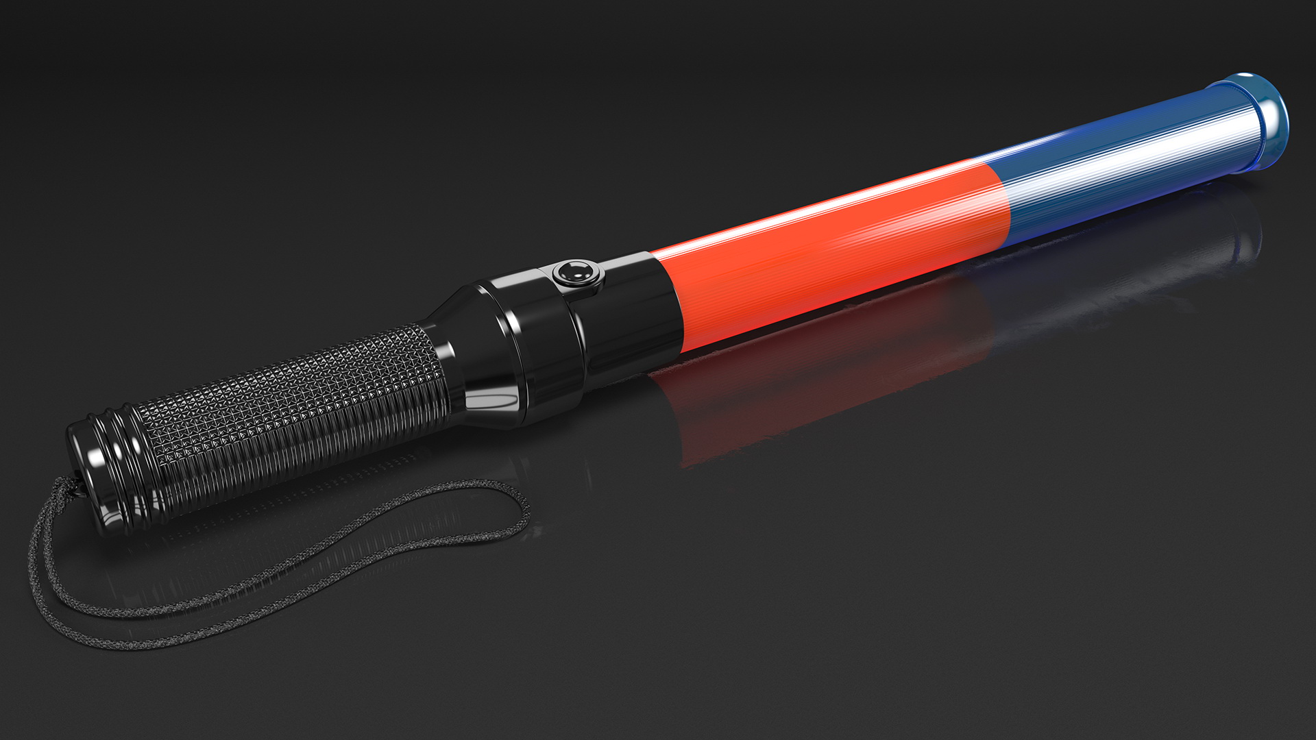 The cylindrical traffic control baton a traditional police guard directing accessory with special handle, and LED lighting to make it more visible as a signaling aid in directing traffic.