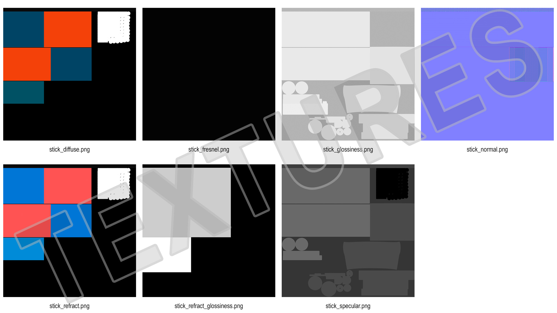 All textures and materials are included and mapped. (All colors can be easily modified.)