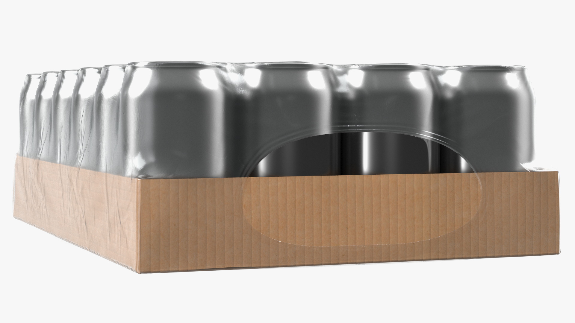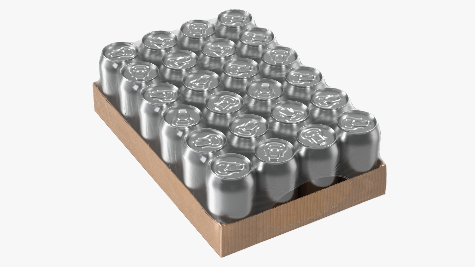 Transparent Pack of 24pcs 330ml Aluminium Cans is a three-dimensional model of set of foil wrapped aluminum beverage cans with a carton palette (basic plate), which is a widespread, popular and well known foil wrap type package.