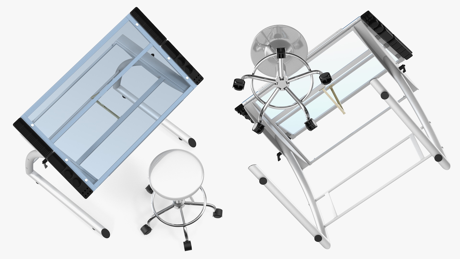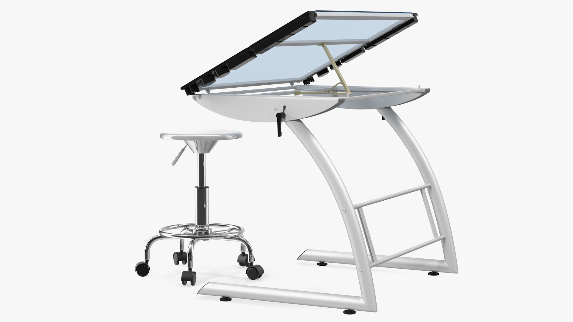 A height adjustable tiltable glass drawing table set with drafting table, and special stool.