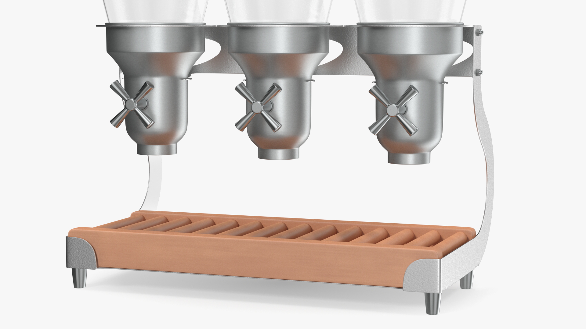 Triple Food Dispensers For Kitchen Wooden Base is a 3d model of containers that holds mainly dry food, which customers can use to dispense portion-sized amounts of the food it contains, by turning a crank knob.