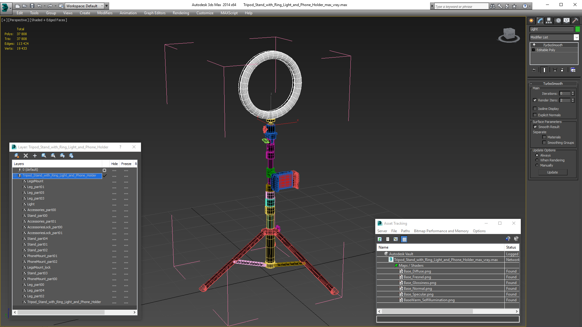 Tripod Stand with Ring Light and Phone Holder is a high quality, photo real 3d model that will enhance detail and realism to any of your rendering projects. The model has a fully textured, detailed design that allows for close-up renders, and was originally modeled in 3ds Max 2020 and rendered with V-Ray. Renders have no postprocessing!