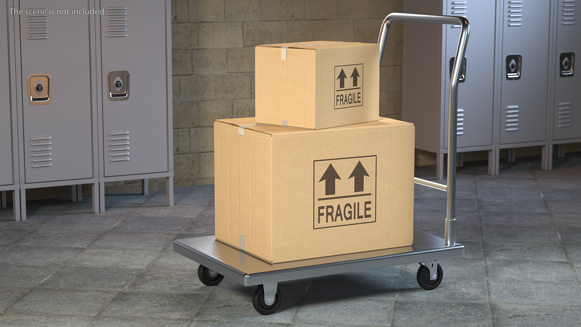 Trolley Low Platform with Cardboard Boxes is a three-dimensional model of a square carton containers with manual wheeled transport equipment, which used for transportation of equipment, food, various devices, goods and materials.