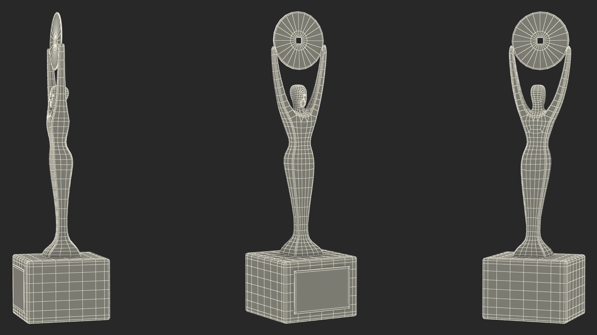 Trophy for High Achievement is a 3D model of a stylized human figure, which arms reaching over its head to hold a large circular disk representing a record, and which is annual music award figurine.