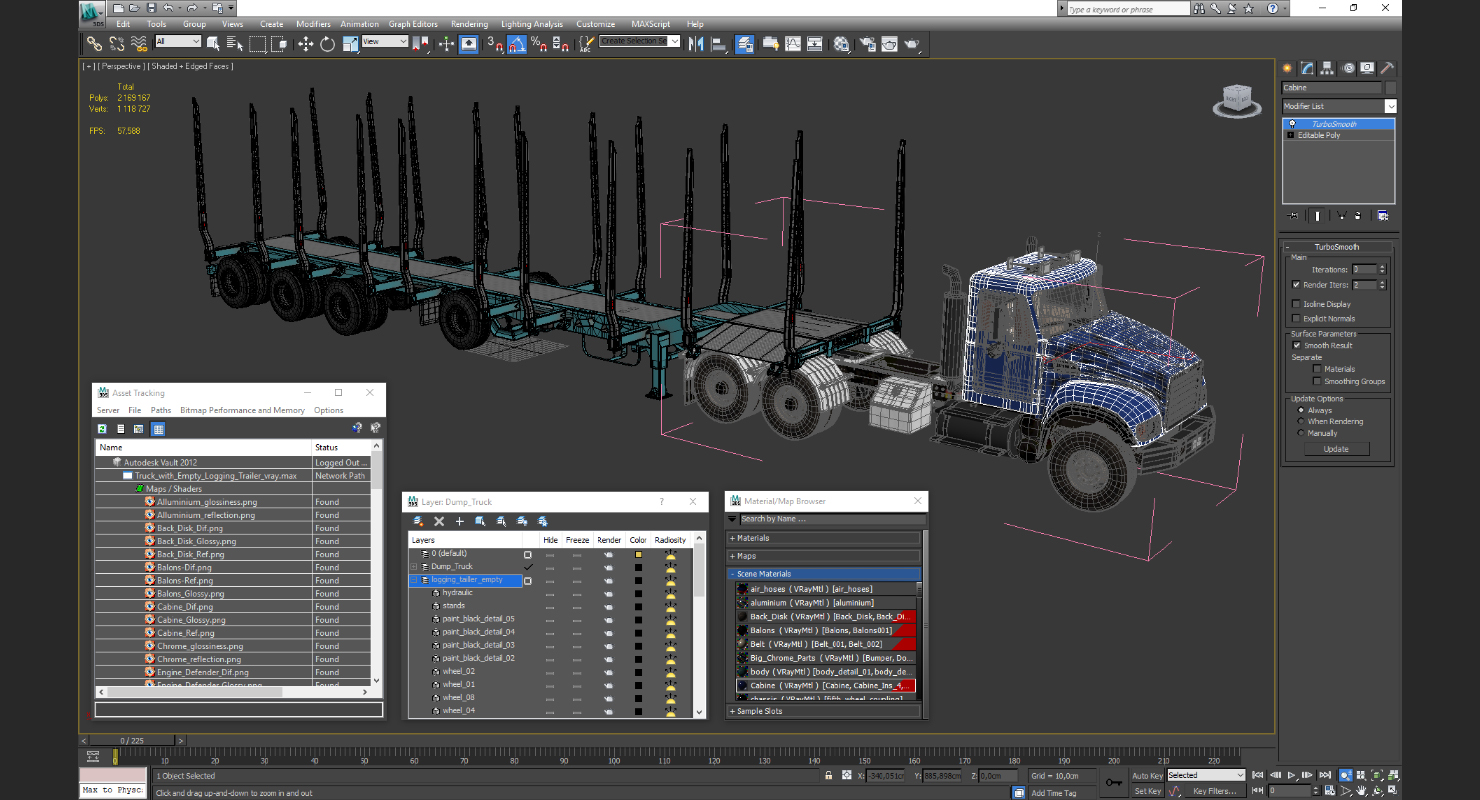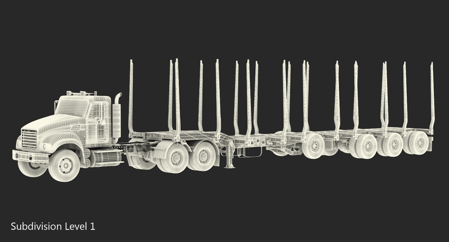 Truck with Empty Logging Trailer is a high quality, photo real 3d model that will enhance detail and realism to any of your rendering projects. The model has a fully textured, detailed design that allows for close-up renders, and was originally modeled in 3ds Max 2020 and rendered with V-Ray. Renders have no postprocessing!