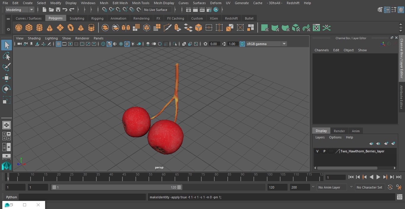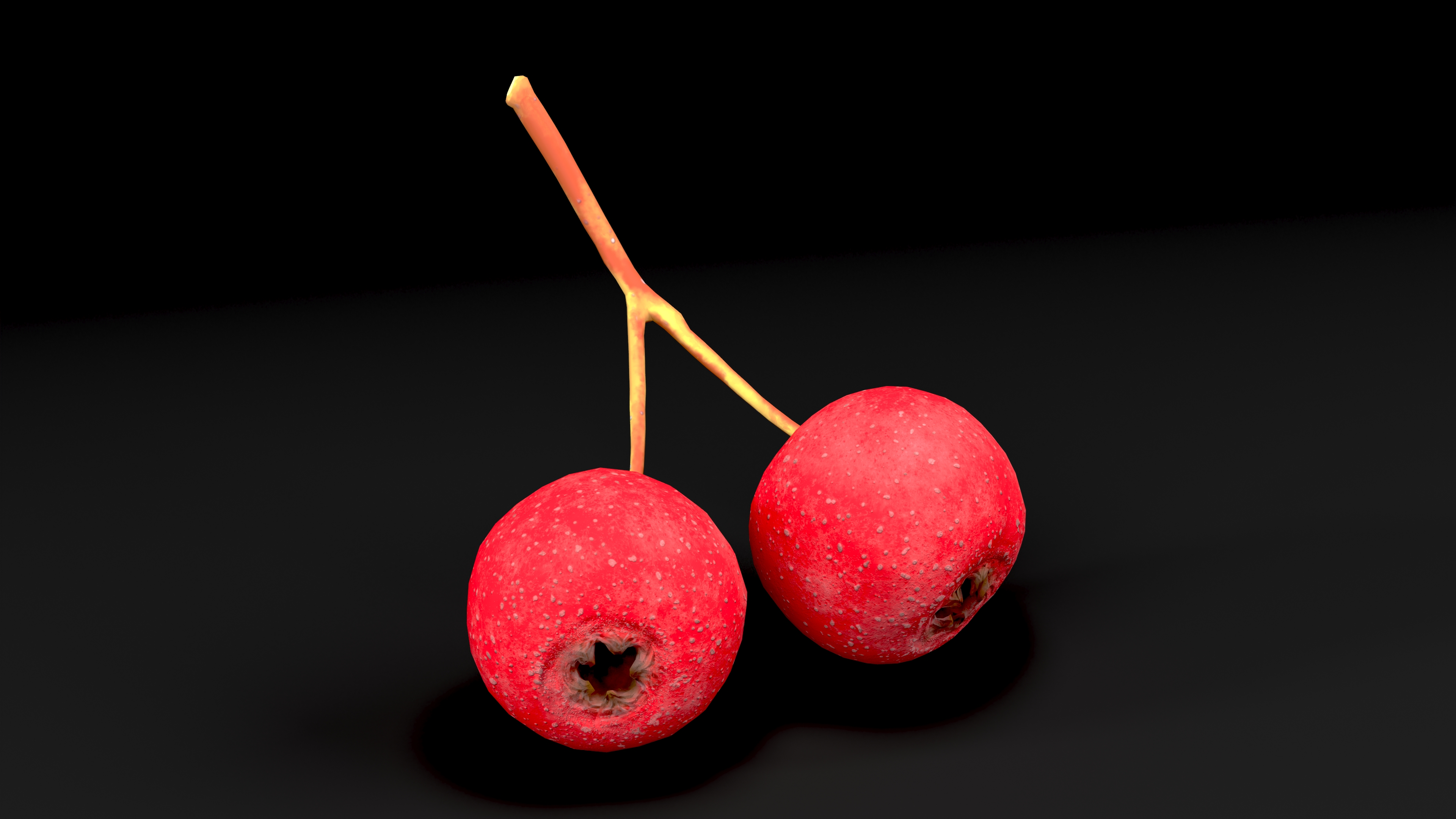 Two Hawthorn Berries is a three-dimensional model of red edible fruits of hawthornberry shrub which is a well known plant in the family Rosaceae.