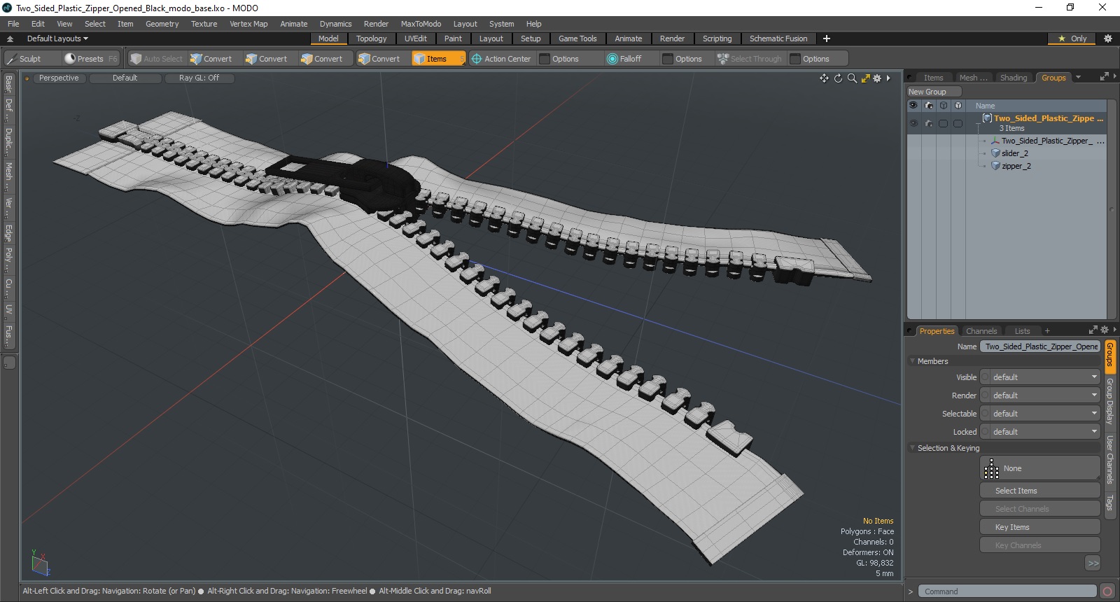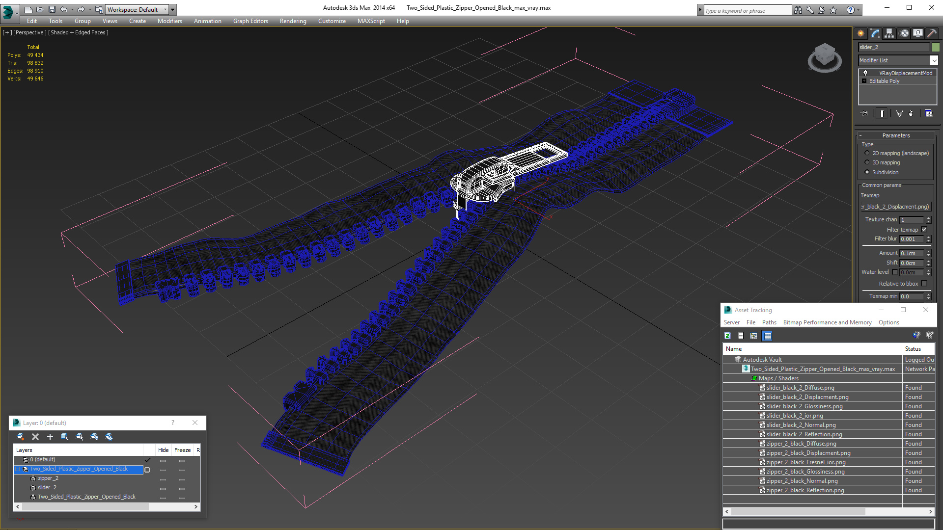 Two Sided Plastic Zipper Opened Black is a high quality, photo real 3d model that will enhance detail and realism to any of your rendering projects. The model has a fully textured, detailed design that allows for close-up renders, and was originally modeled in 3ds Max 2020 and rendered with V-Ray. Renders have no postprocessing!