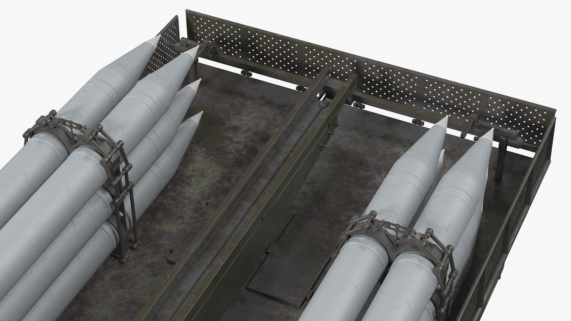 TZM 9T234 2 Transloader with Crane and Rockets Rigged a Russia military heavy-duty truck transloader with a Smerch special 850 kg rocket missile crane and spare rocket projectiles.
