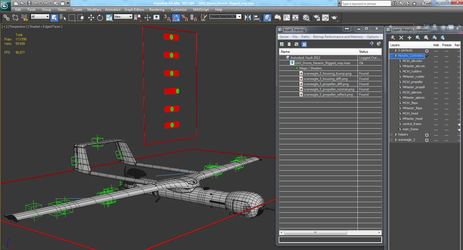 UAV Drone Generic Rigged is fully rigged and is ready to be animated. You can easily position it the way you need or animate it the way your project requires using helpers in 3D Studio Max. See the turntable to get an idea of how rigging works.