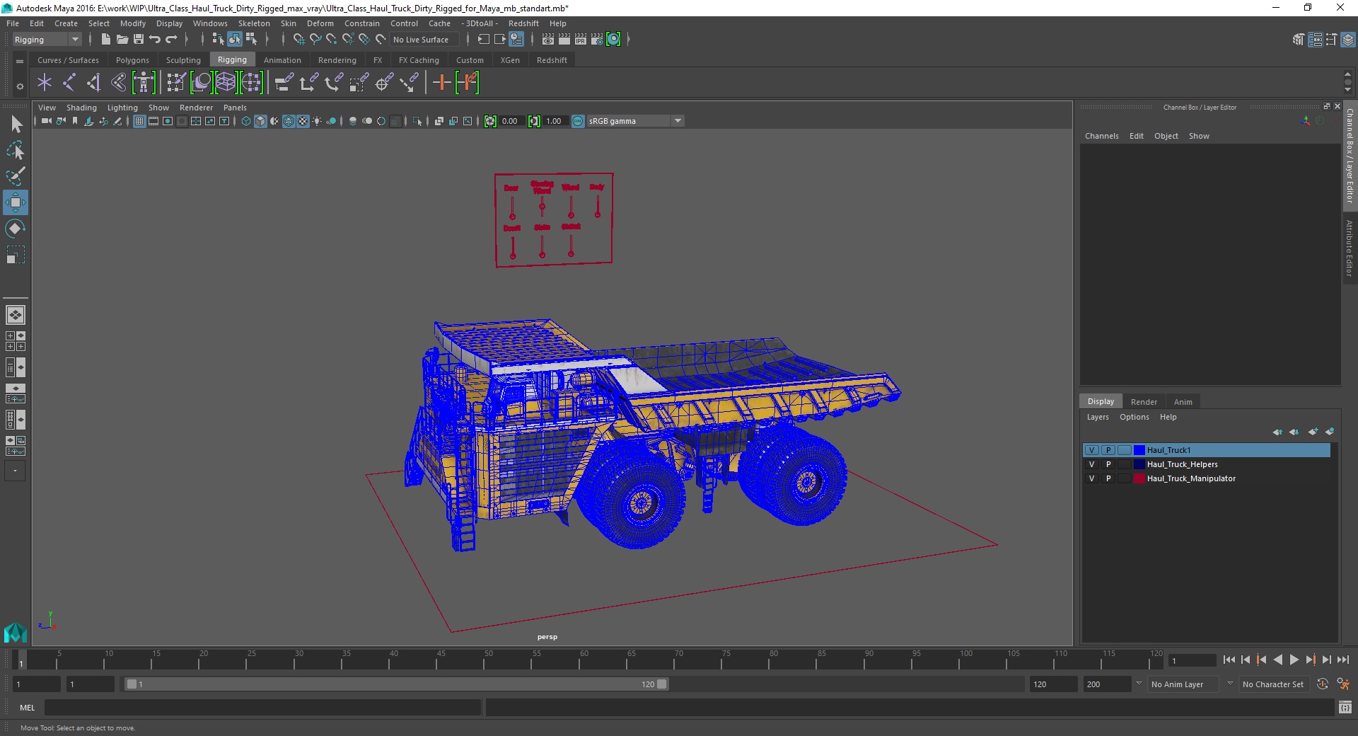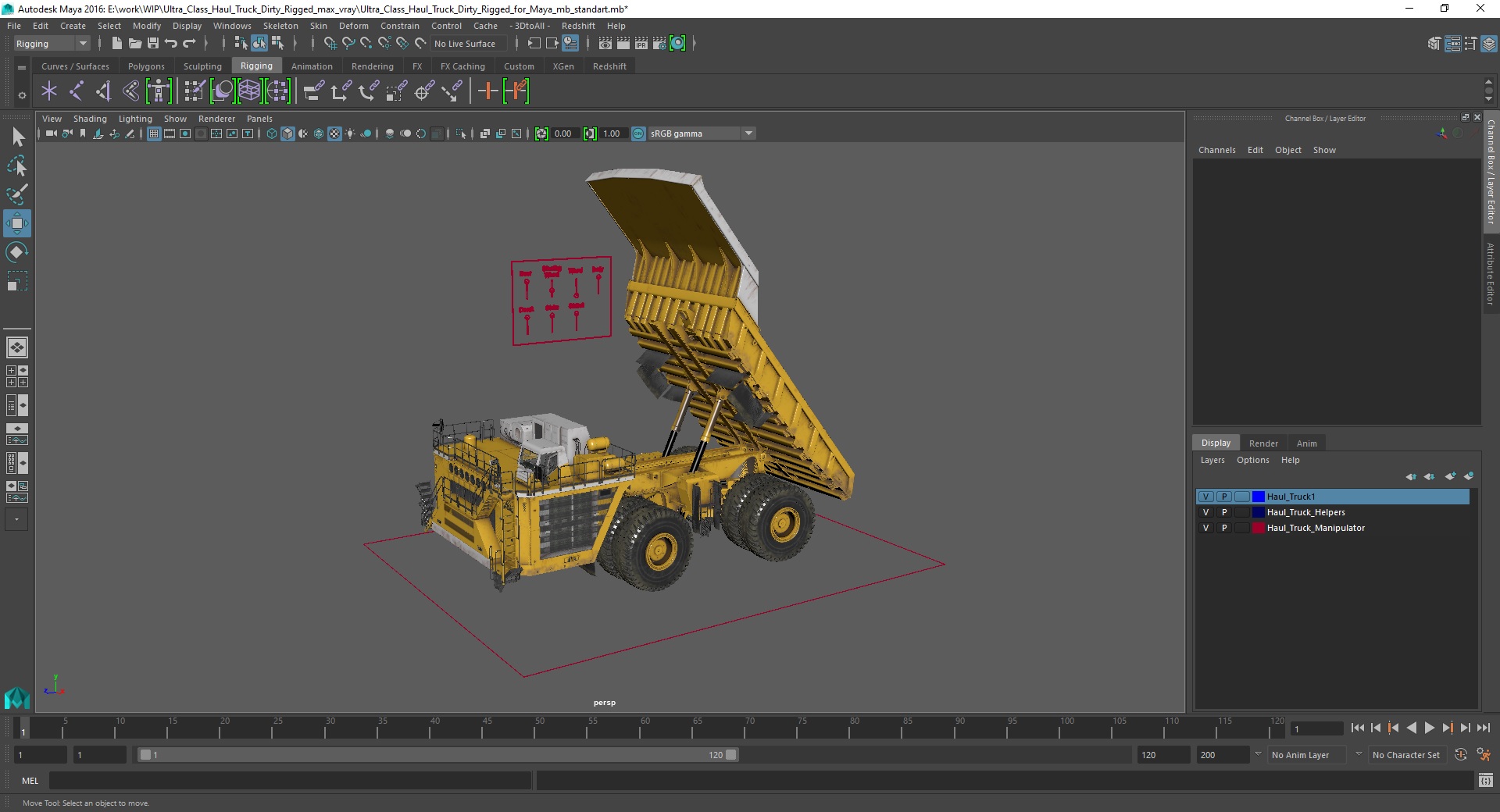 Ultra Class Haul Truck Dirty Rigged for Maya is fully rigged and is ready to be animated in Maya. You can easily position it the way you need or animate it the way your project requires. See the screenshots to get an idea of how rigging works. The pose of the model on the render images is an example and can be recreated using rig, it is not initially included into the product.